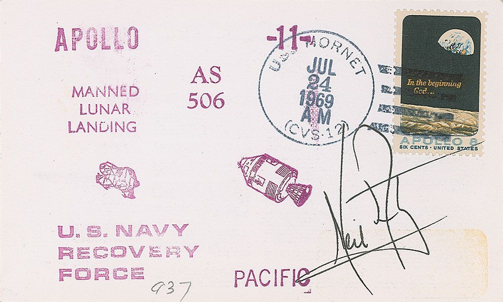 Possibly one-of-a-kind Apollo 11 prime recovery ship commemorative cover, on a 5.5 x 3.25 card, bearing a stamped cachet honoring the naval recovery, with the Astronaut Rescue Treaty printed on the reverse, signed on the front in black ink by Armstrong. In fine condition, with a light block of toning under portion of Armstrong’s signature (most likely from a previous address label), and a small pencil notation along bottom edge.