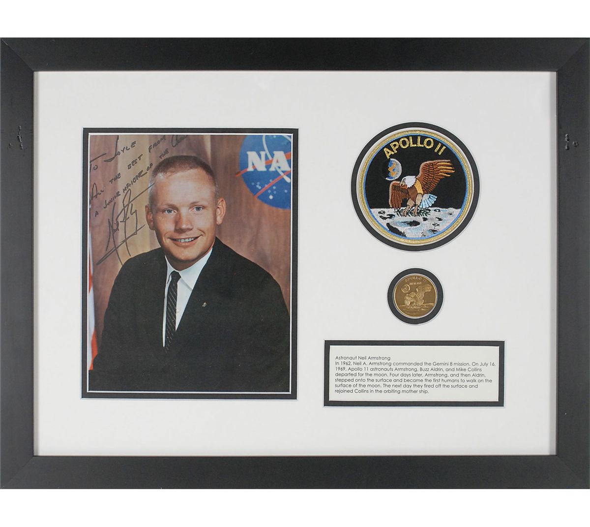 Color official NASA 8 x 10 lithograph of Armstrong in a dark jacket and tie, signed and inscribed in black felt tip, “To Joyce, All the best from a junior member of the crew, Neil Armstrong.” Double-matted and framed with an Apollo 11 patch and medallion and a printed biography to an overall size of 21.25 x 16.25. In fine condition. Inscribed to longtime NASA employee Joyce Abrams, who was a senior member of the ground support team.