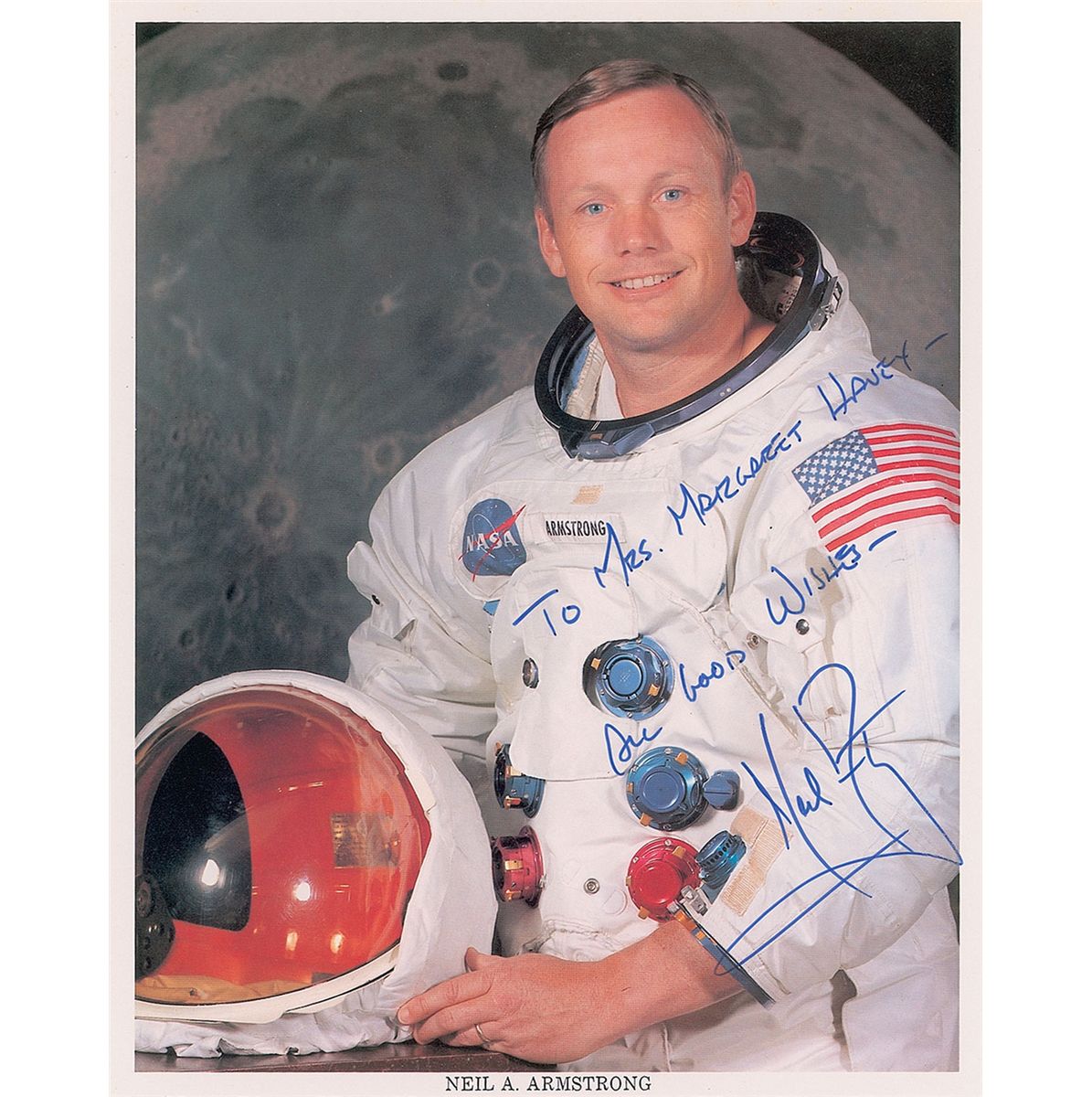 Official color 8 x 10 NASA lithograph of Armstrong in his white space suit posing against a lunar background, signed and inscribed in blue felt tip, “To Mrs. Margaret Haney—All good wishes—Neil Armstrong.” In fine condition, with a couple of light paperclip impressions to top edge. Accompanied by a full letter of authenticity from PSA/DNA.