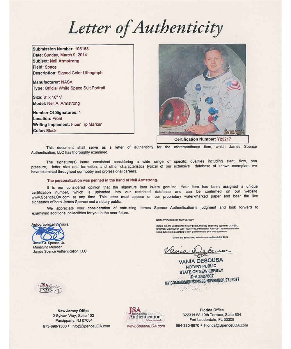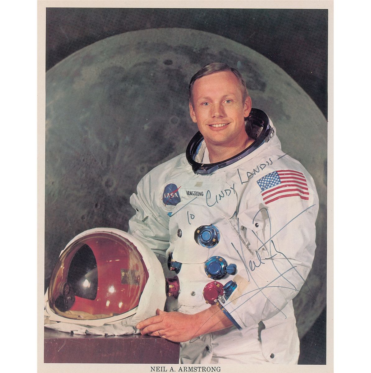Official color 8 x 10 NASA lithograph of Armstrong in his white space suit, signed and inscribed in black felt tip, “To Cindy Landis—Neil Armstrong.” Photo is affixed to an 8.5 x 11 magnetic album page. Some scattered light creases and wrinkles, otherwise fine condition. Accompanied by a letter of authenticity from James Spence.