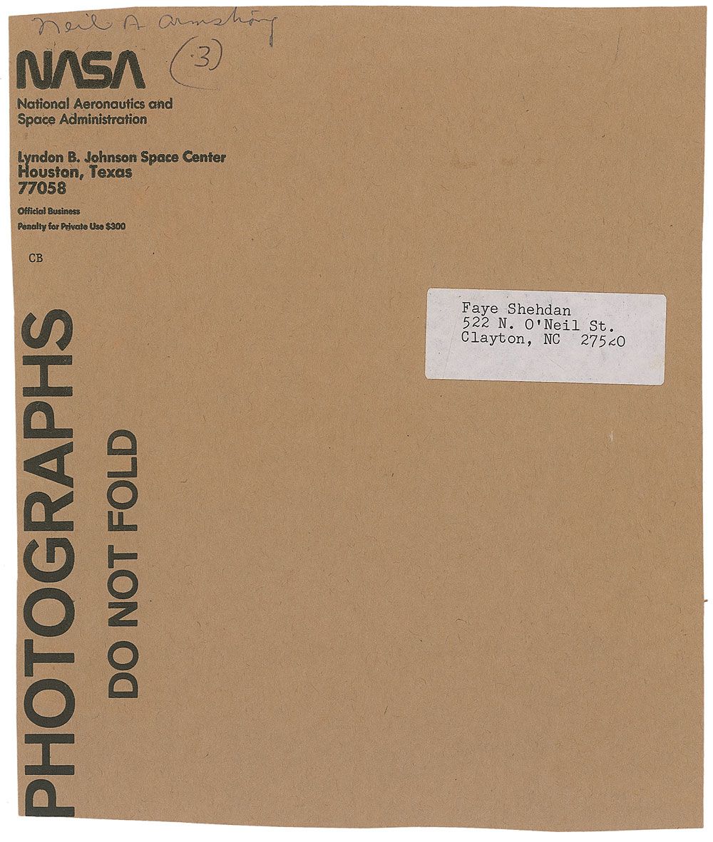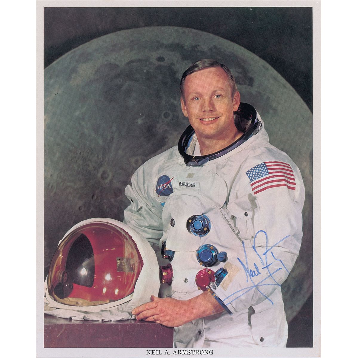 Official uninscribed color 8 x 10 NASA lithograph of Armstrong posing in his white space suit, signed in blue felt tip. In fine condition, with a paperclip impression and a couple of small creases to top edge. Accompanied by the original NASA mailing envelope panel.