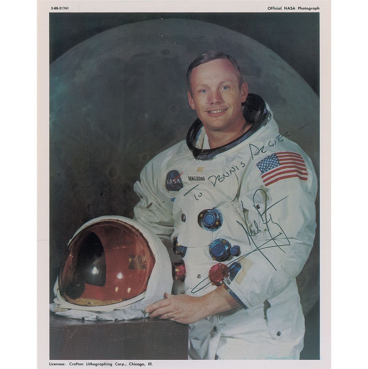 Official color 7.25 x 9.25 NASA photo of Armstrong posing in his white space suit against a lunar background, signed and inscribed in black felt tip, “To Dennis Arcieri—Neil Armstrong.” In fine condition, with a few scattered light surface impressions, and a trivial brush to inscription. An example of unusual size (it is not trimmed), imprinted in the top border “Official NASA Photograph” and in the lower border “Licensee: Crofton Lithographing Corp, Chicago, Ill.”