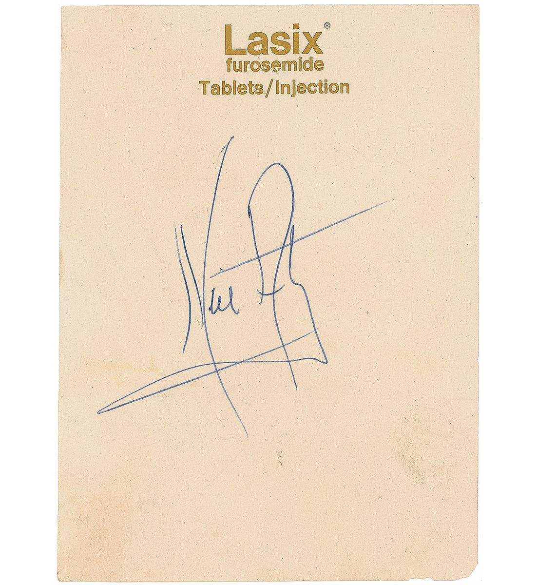 Ballpoint signature, “Neil Armstrong,” on an off-white 4.5 x 6 Lasix medication sheet. Scattered creases and mild soiling, otherwise fine condition.