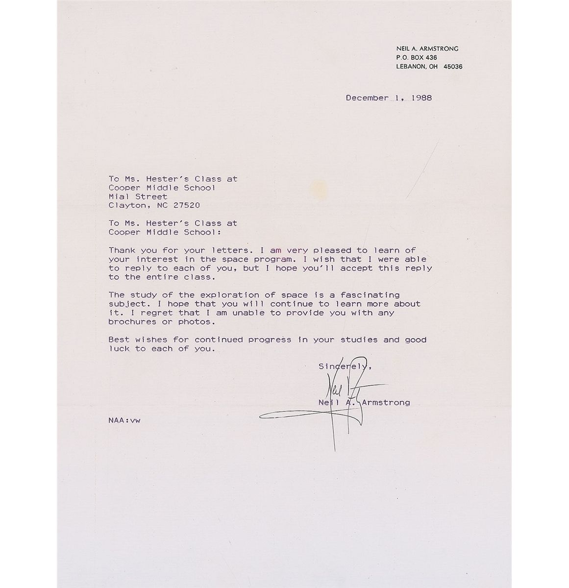 TLS, one page, 8.5 x , personal letterhead, December 1, 1988. Letter to Ms. Hester’s middle school class. In part: “I am very pleased to learn of your interest in the space program…The study of the exploration of space is a fascinating subject. I hope that you will continue to learn more about it.” A small stain to the upper portion and two sets of staple holes to the top, otherwise fine condition. Accompanied by the original mailing envelope.