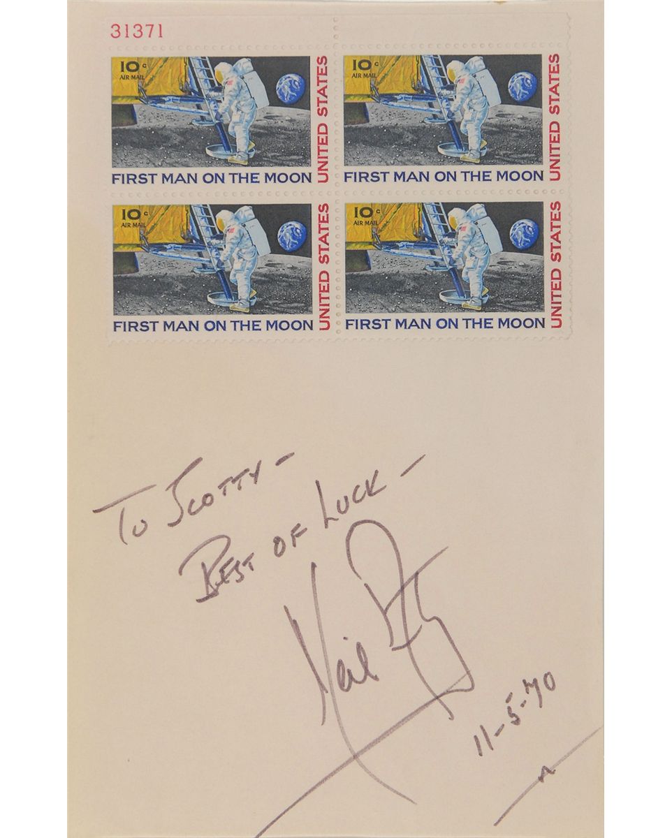 Felt tip signature and inscription, “To Scotty—Best of luck—Neil Armstrong 11-5-70,” on an off-white 4.5 x 7 sheet with a block of four first man on the moon stamps affixed to top edge. Encapsulated in a plastic PSA/DNA authentication holder. In fine condition, with a uniform shade of mild toning.