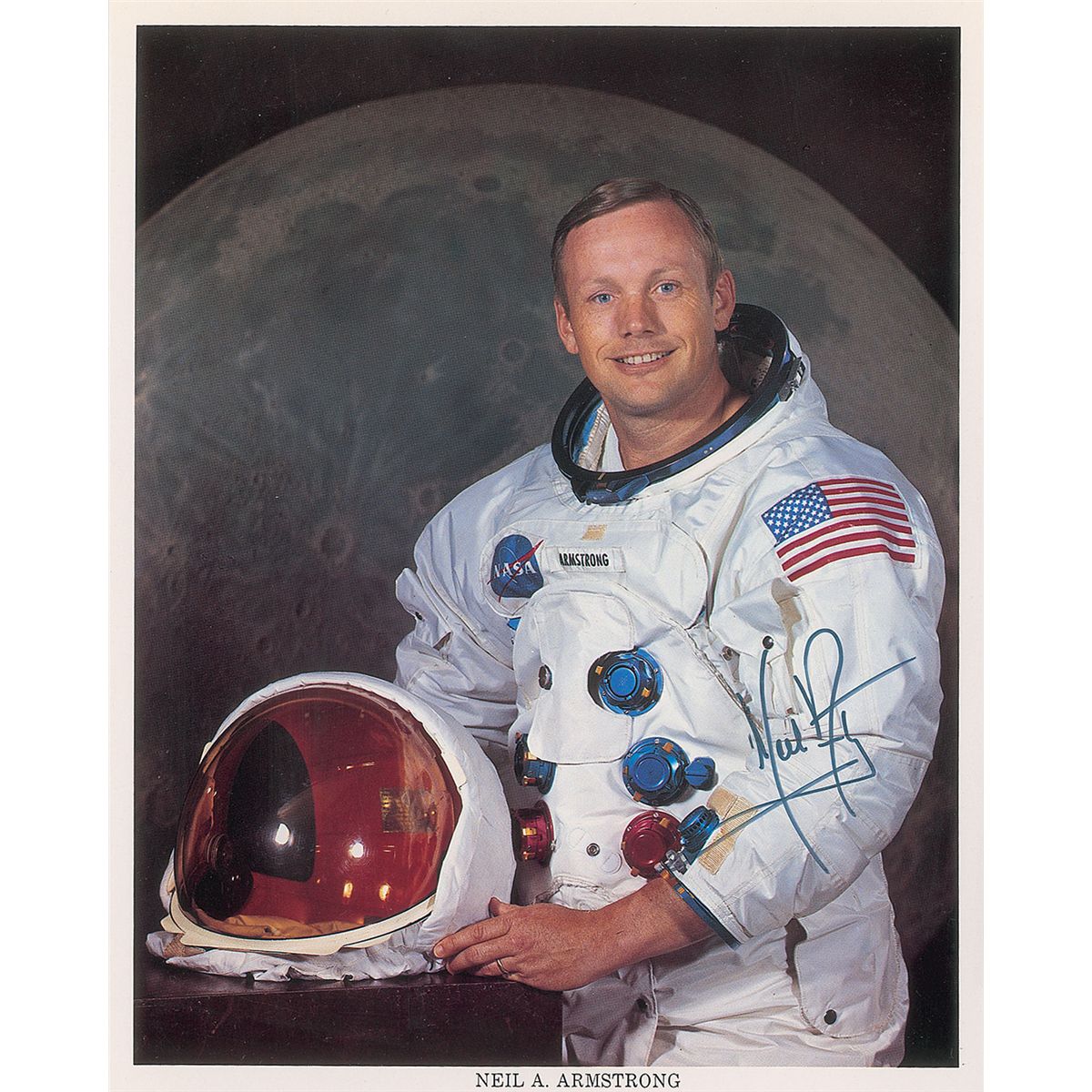 Official and highly desirable uninscribed color 8 x 10 NASA lithograph of Armstrong posing in his white space suit, signed in black felt tip. In fine condition.