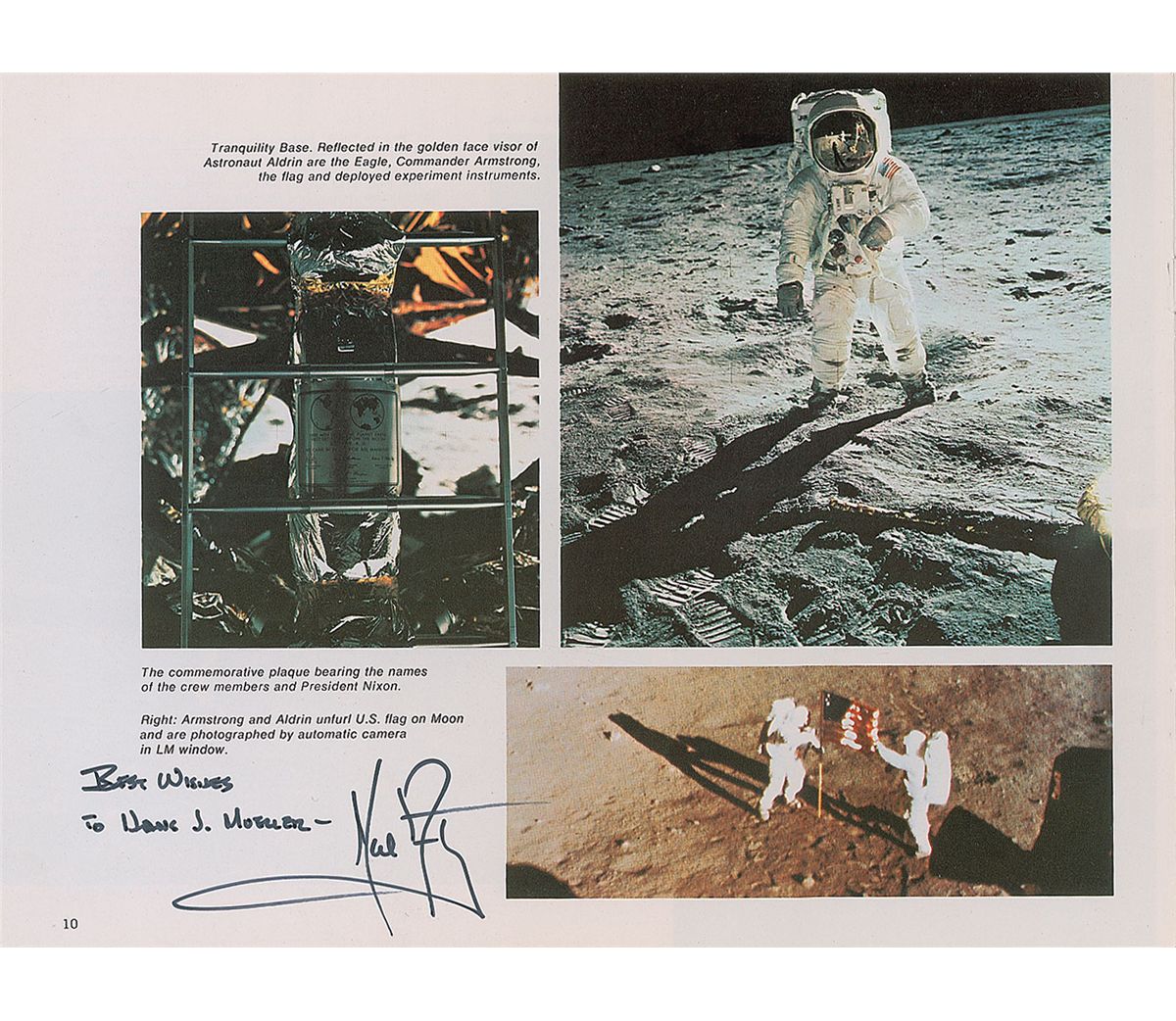 Official NASA booklet entitled ‘Log of Apollo 11,’ 10.25 x 7.75, 11 pages, signed and inscribed inside in black felt tip, “Best wishes to Hans J. Moeller—Neil Armstrong.” In fine condition, with the cover folded back to show the signed page. The signature is well-placed beside an image of Armstrong and Aldrin unfurling the American flag on the lunar surface. Signed photos of Armstrong on the lunar surface are exceedingly rare.