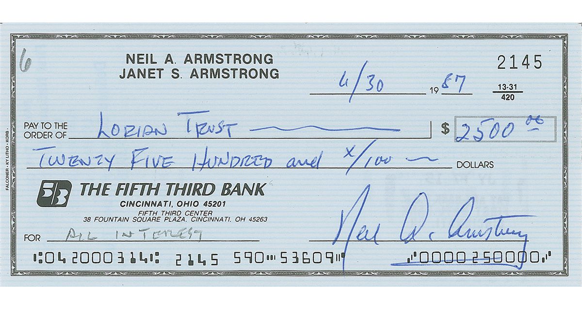 Exceptionally desirable personal check, 6 x 2.75, filled out and signed by Armstrong, “Neil A. Armstrong,” payable to Lorian Trust for $2500.00, June 30, 1987. Pencil notation by Armstrong on the memo line reads, “All Interest.” In very fine condition. In 1973, Armstrong was president of Lorian, Inc., a business in Lebanon, Ohio, where he lived at the time. An uncommon and much sought-after form of Armstrong’s autograph.