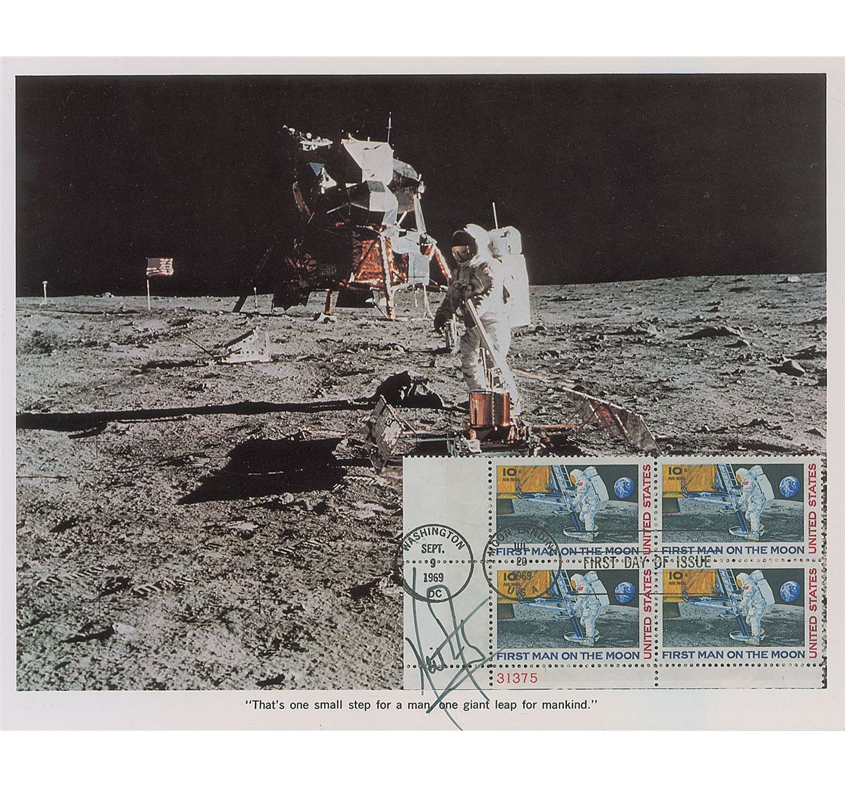 Color 10 x 8 cardstock photo of Buzz Aldrin working on the lunar surface, with Armstrong’s memorable first words from the moon printed in the lower border, and a block of four ‘First Man on the Moon’ postage stamps affixed to the lower right corner, signed in the border of the stamp block in black felt tip. Stamp block also bears a First Day of Issue stamp and a moon landing cancellation. In fine condition. Armstrong is notoriously difficult to find on any philatelic-related items.