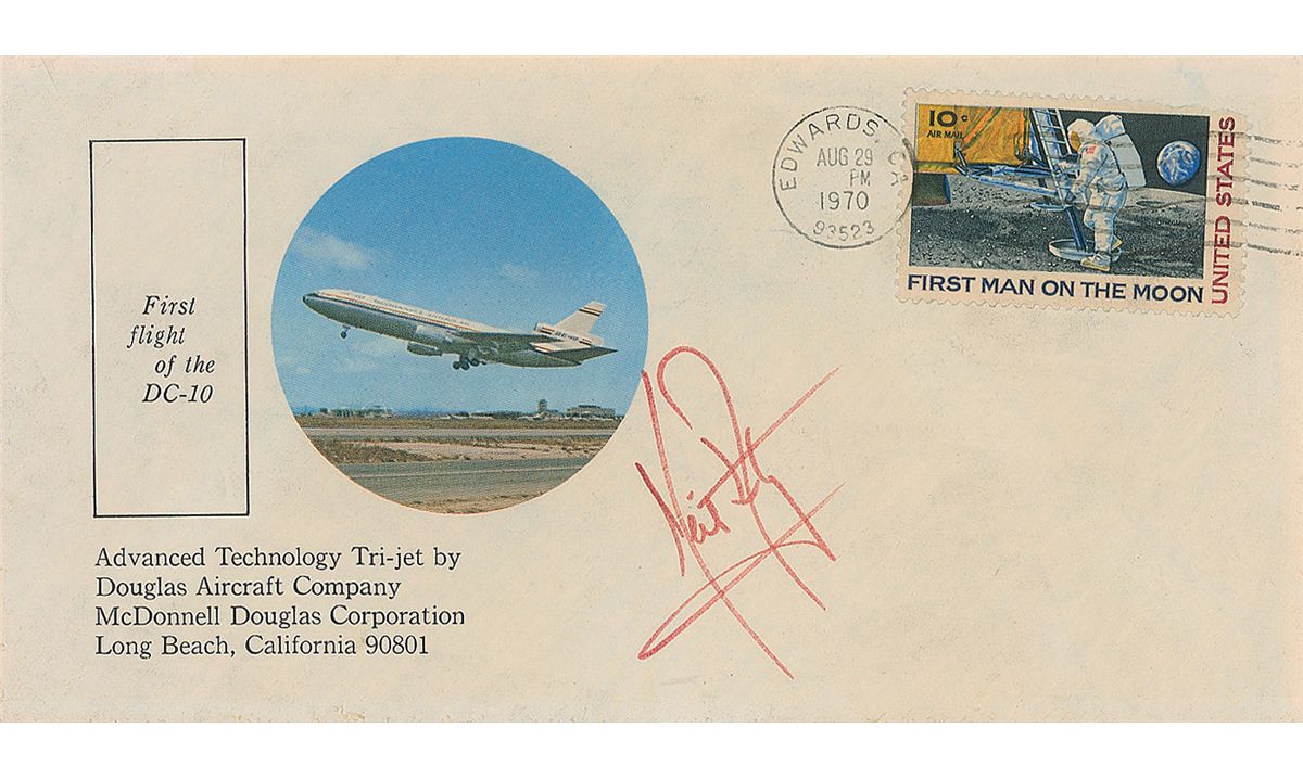 McDonnell Douglas commemorative cover, 7.25 x 4, with a cachet honoring the first flight of the DC-10, signed in red felt tip. In fine condition.