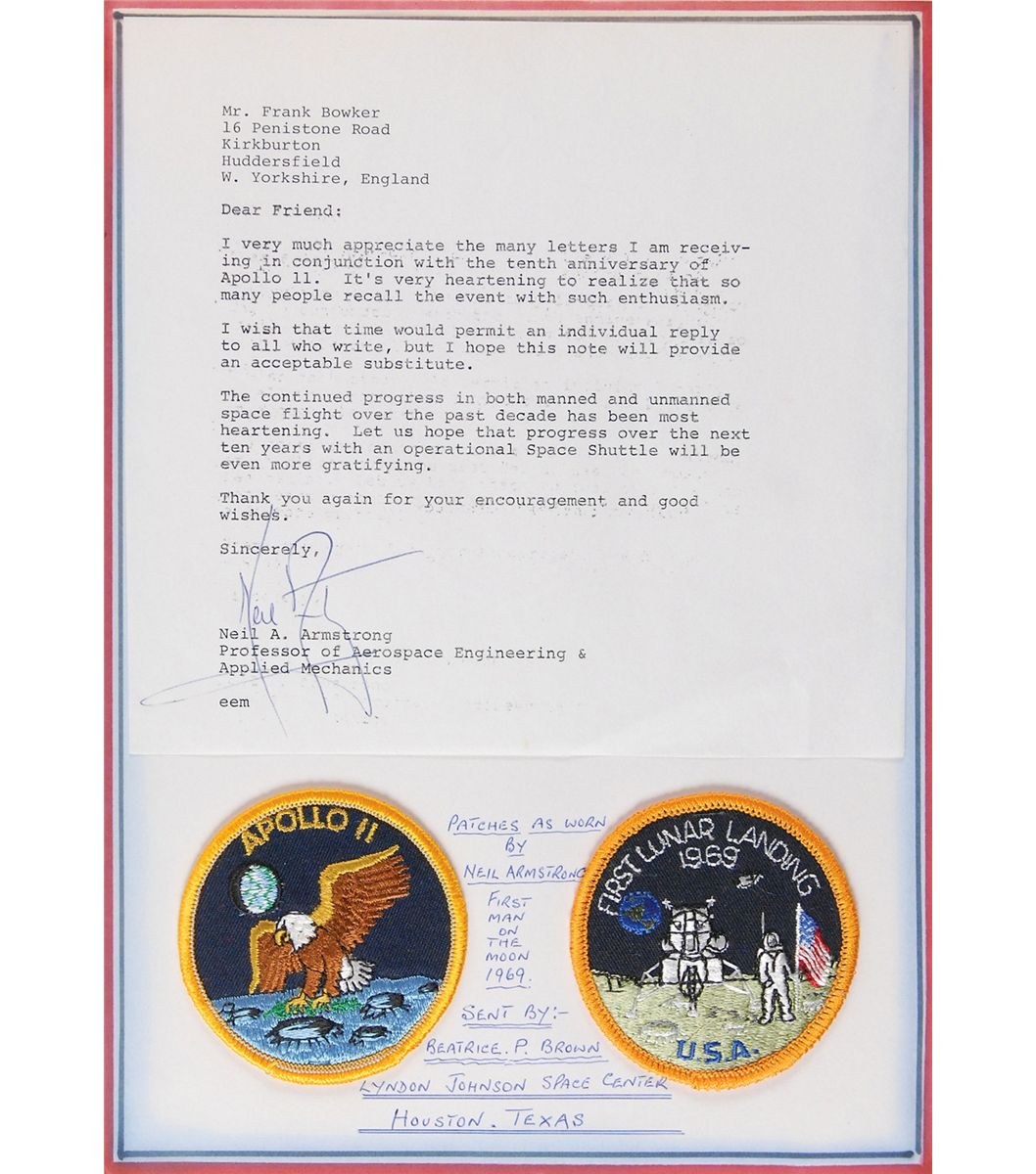 TLS, one page, 7.75 x 7.25, no date but circa July 1979. A printed form letter sent to well-wishers on the tenth anniversary of the Apollo 11 mission. In part: “I very much appreciate the many letters I am receiving in conjunction with the tenth anniversary of Apollo 11. It’s very heartening to realize that so many people recall the event with so much enthusiasm…The continued progress in both manned and unmanned space flight over the past decade has been most heartening. Let us hope that progress over the next ten years with an operational Space Shuttle will be even more gratifying.” In fine condition, with creases to the lower right corner and trimmed edges. Accompanied by a sheet with two souvenir Apollo 11 patches affixed at the bottom, upon which the letter could be set for display. Superb content from the first man on the moon.