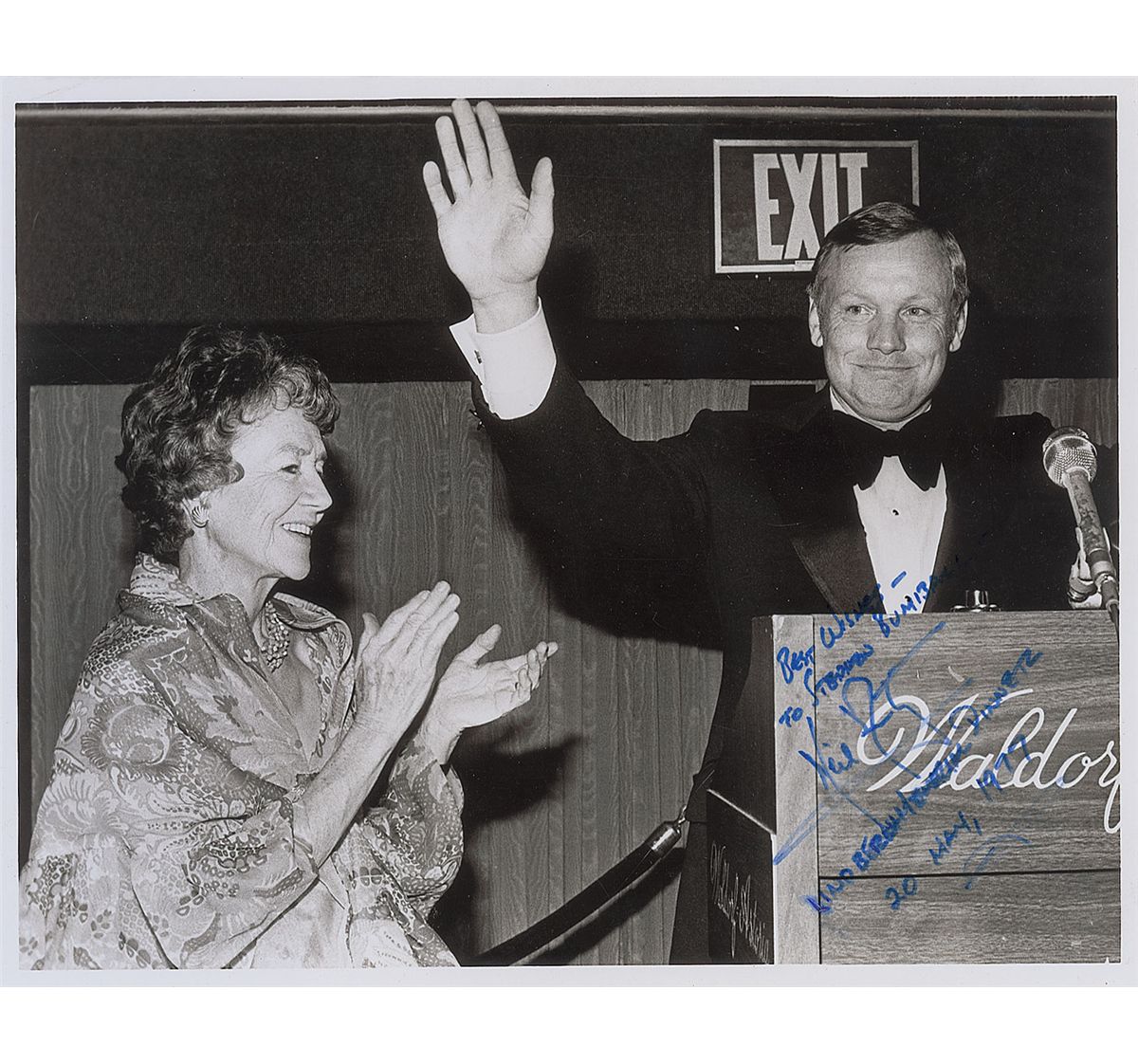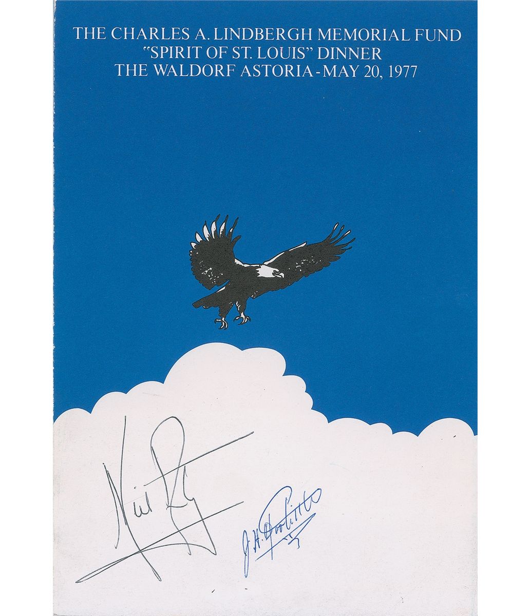 Exceptional pairing of a Lindbergh memorial event program and photo of Armstrong in attendance: a program from the ‘Spirit of St. Louis’ fundraising dinner for the Charles A. Lindbergh Memorial Fund held at the Waldorf-Astoria on May 20, 1977, two pages, 6.75 x 9.75, signed on the front in ballpoint by Neil Armstrong and James H. Doolittle; and a glossy 10 x 8 photo of Armstrong with Anne Morrow Lindbergh at the event, signed and inscribed in blue felt tip, “Best wishes—to Stephen…Neil Armstrong, Lindbergh Memorial Dinner, 20 May, 1977.” In overall fine condition. Armstrong and Doolittle were co-chairmen of the Charles A. Lindbergh Memorial Fund committee, and this dinner event—held on the 50th anniversary of Lindbergh’s legendary transatlantic flight—capped off a drive to raise $5 million as an endowment for the fund. A tremendous association between titans of flight.