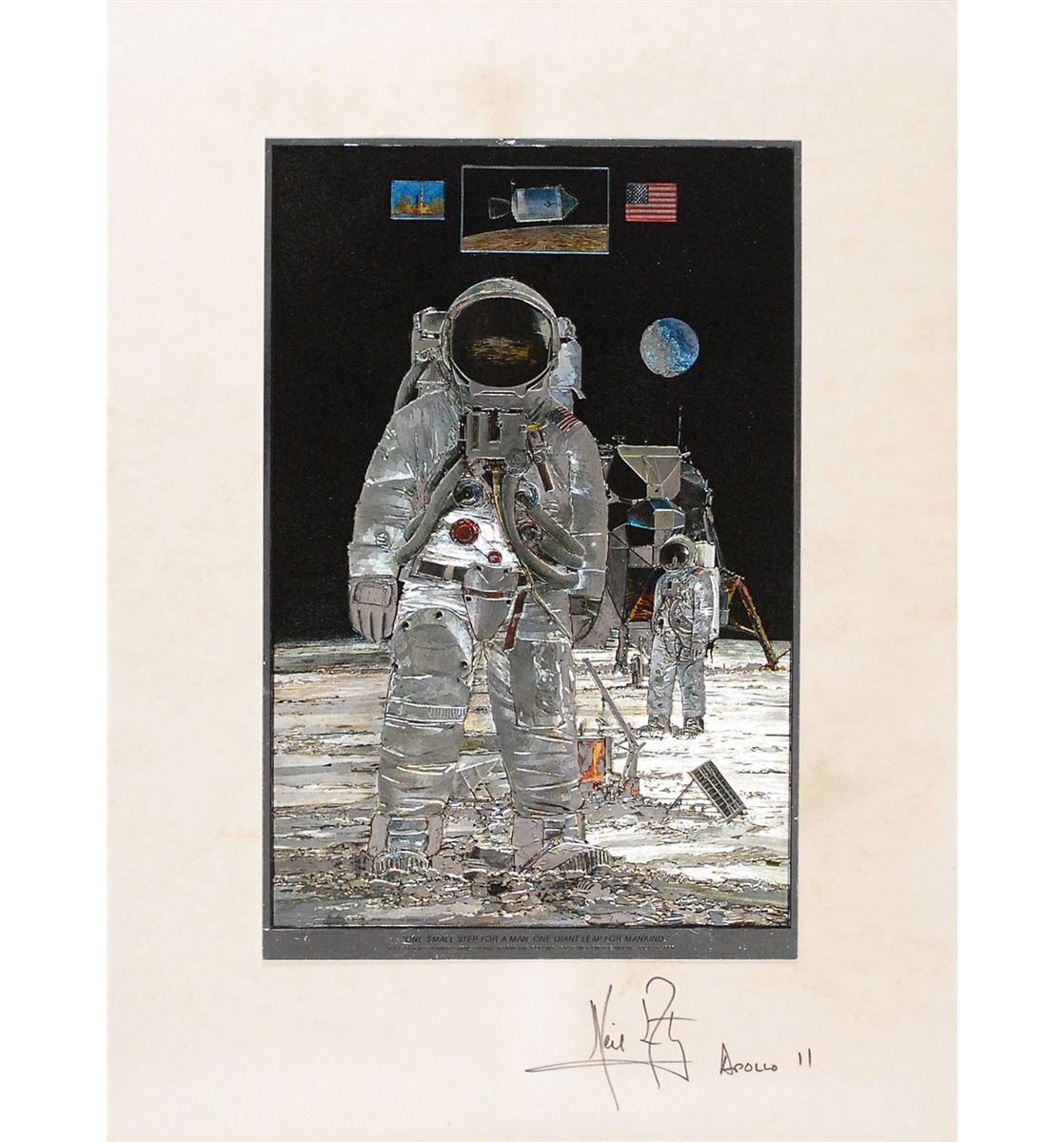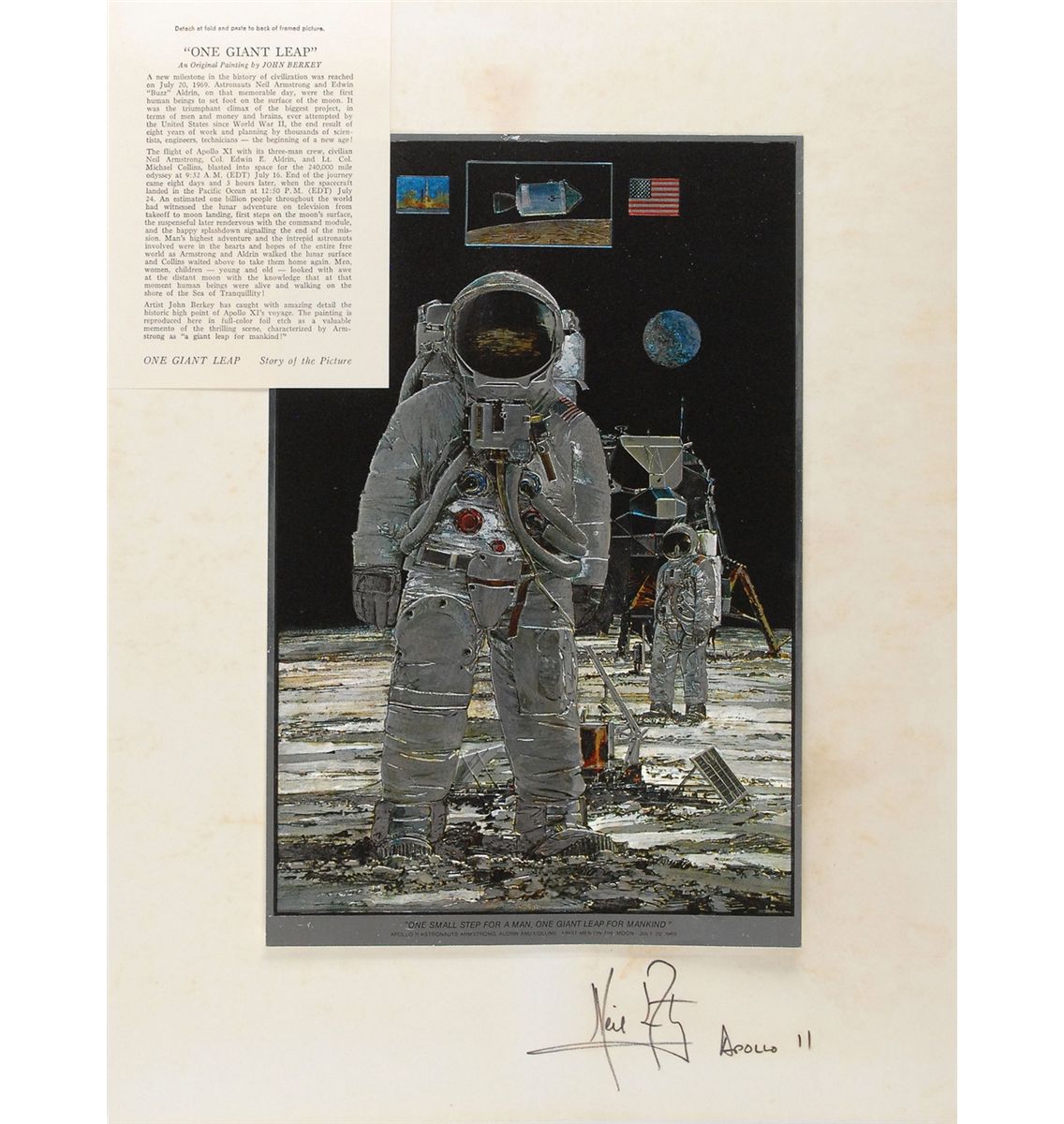 Fabulous color 7.5 x 11.5 foil print entitled ‘One Giant Leap,’ affixed to its original 12 x 16 mount, signed on the mount in black felt tip, “Neil Armstrong, Apollo 11.” The piece retains its original printed caption, stating that the impressive full-color foil etch print is based on an original painting by John Berkey. In very good condition, with scattered foxing and a few creases to print and mount. A wonderful display piece featuring a rare artist’s portrayal of both Armstrong and Aldrin on the lunar surface, highlighted by Armstrong’s uncommon addition of the mission name next to his signature.