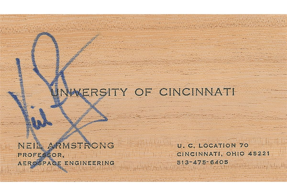 Neat balsa wood business card from Armstrong’s time at the University of Cincinnati, 3.5 x 2, signed on the front in blue felt tip by Armstrong. In fine condition.