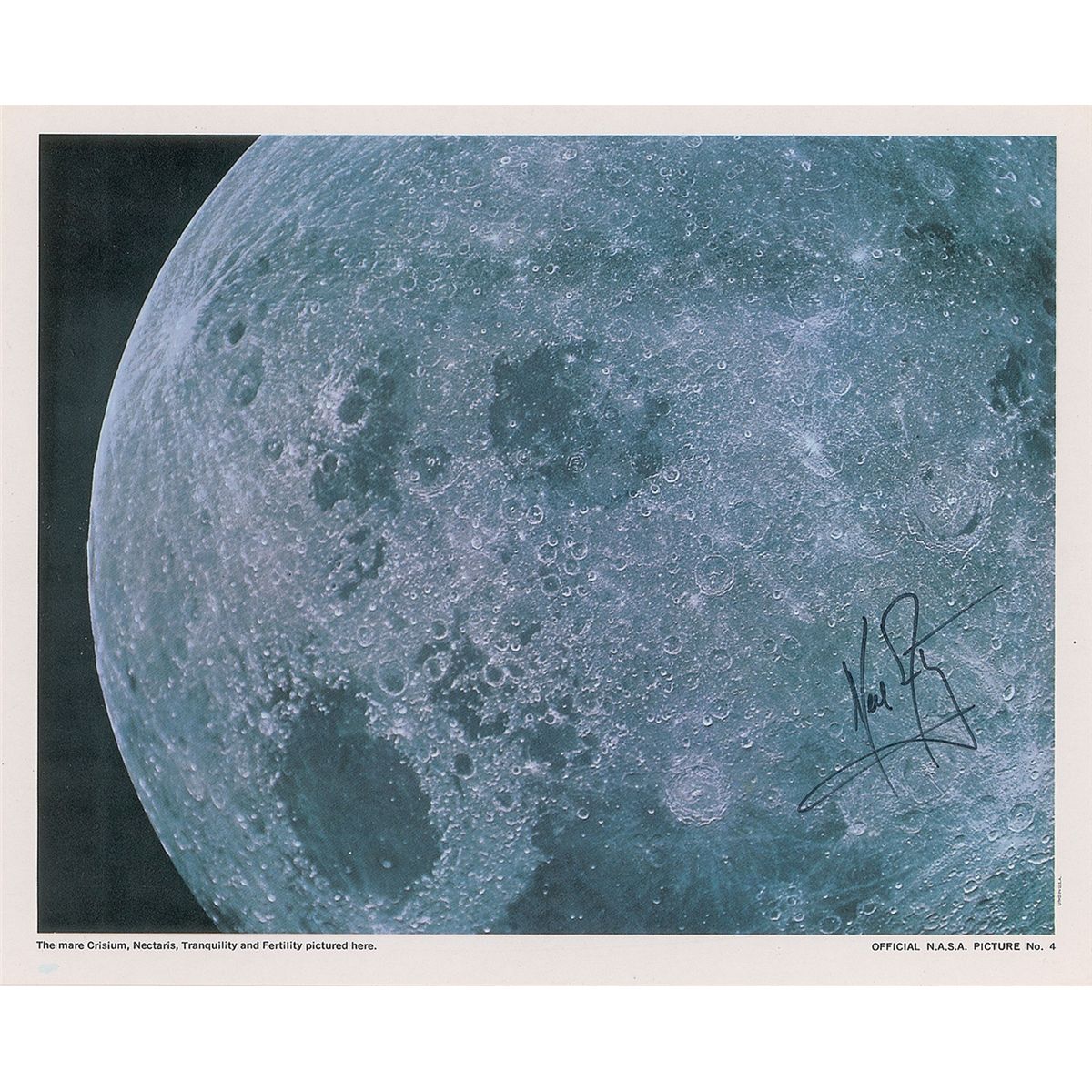 Rare color 8 x 10 paperstock photo of the lunar surface labeled “Official NASA Picture No. 4, The mare Crisium, Nectaris, Tranquility and Fertility pictured here,” signed in the lower right in black felt tip. Light scattered creases, otherwise fine condition.