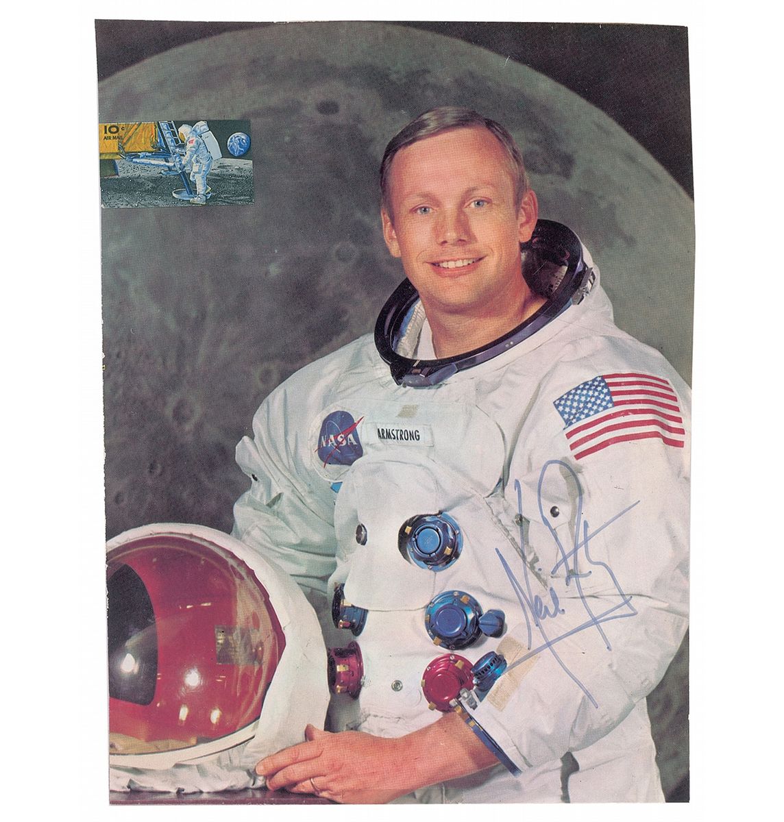 Official color 8 x 10 NASA lithograph of Armstrong in his white space suit, trimmed to a size of 6 x 8.25, signed in blue felt tip. Photo is affixed to an identical size mount. In very good condition, with aforementioned trimmed edges, signature a couple shades light, and a small image of the first man on the moon postage stamp affixed to upper left.