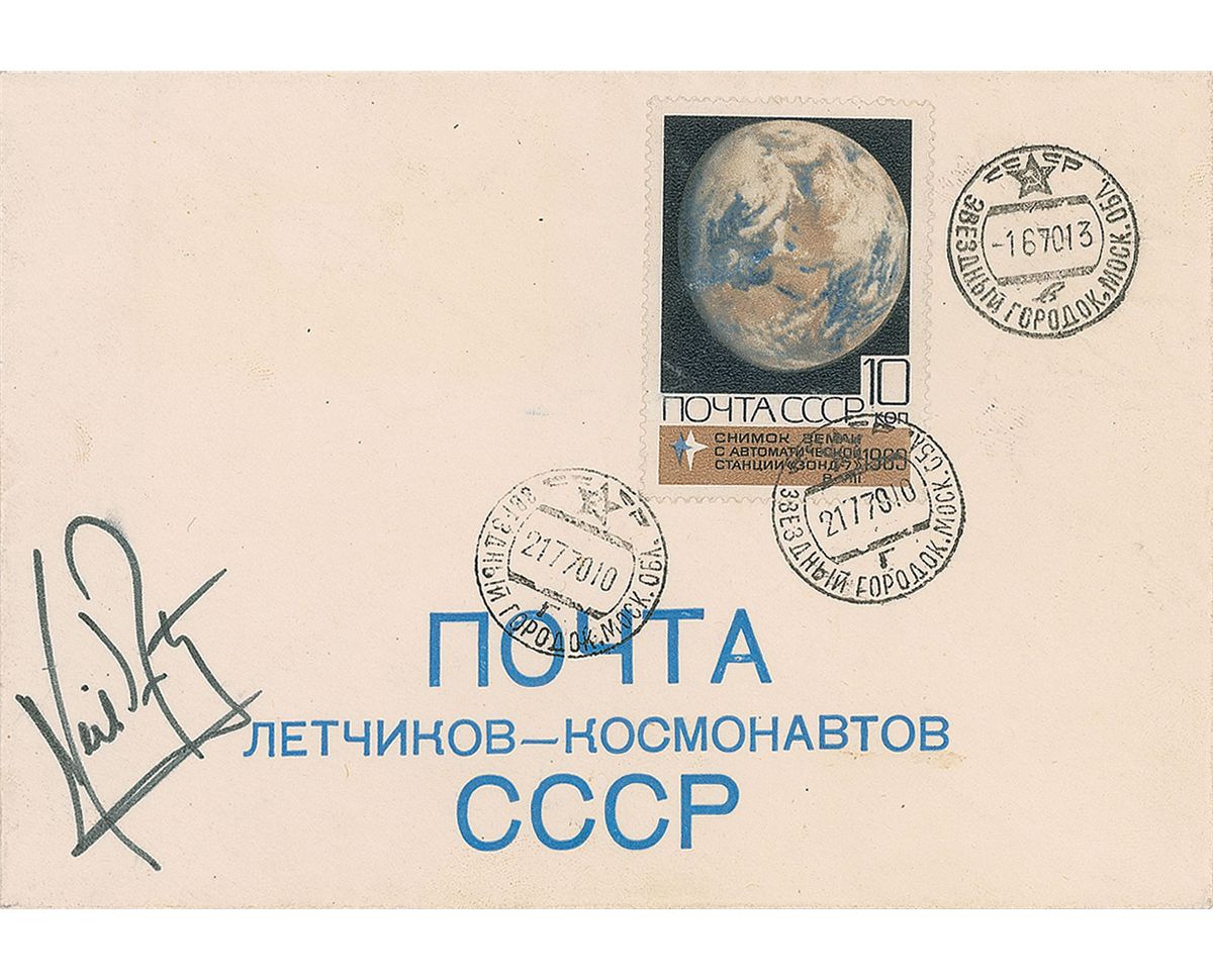 Russian commemorative cover featuring an affixed 1969 postage stamp depicting Earth from outer space, 6 x 4.25, signed in the lower left in black felt tip. In fine condition, with a trivial brush to the top of one letter of the signature. A scarce format, likely signed during Armstrong’s only visit to the USSR in 1970, which helped build relations between NASA and the Soviet space program.