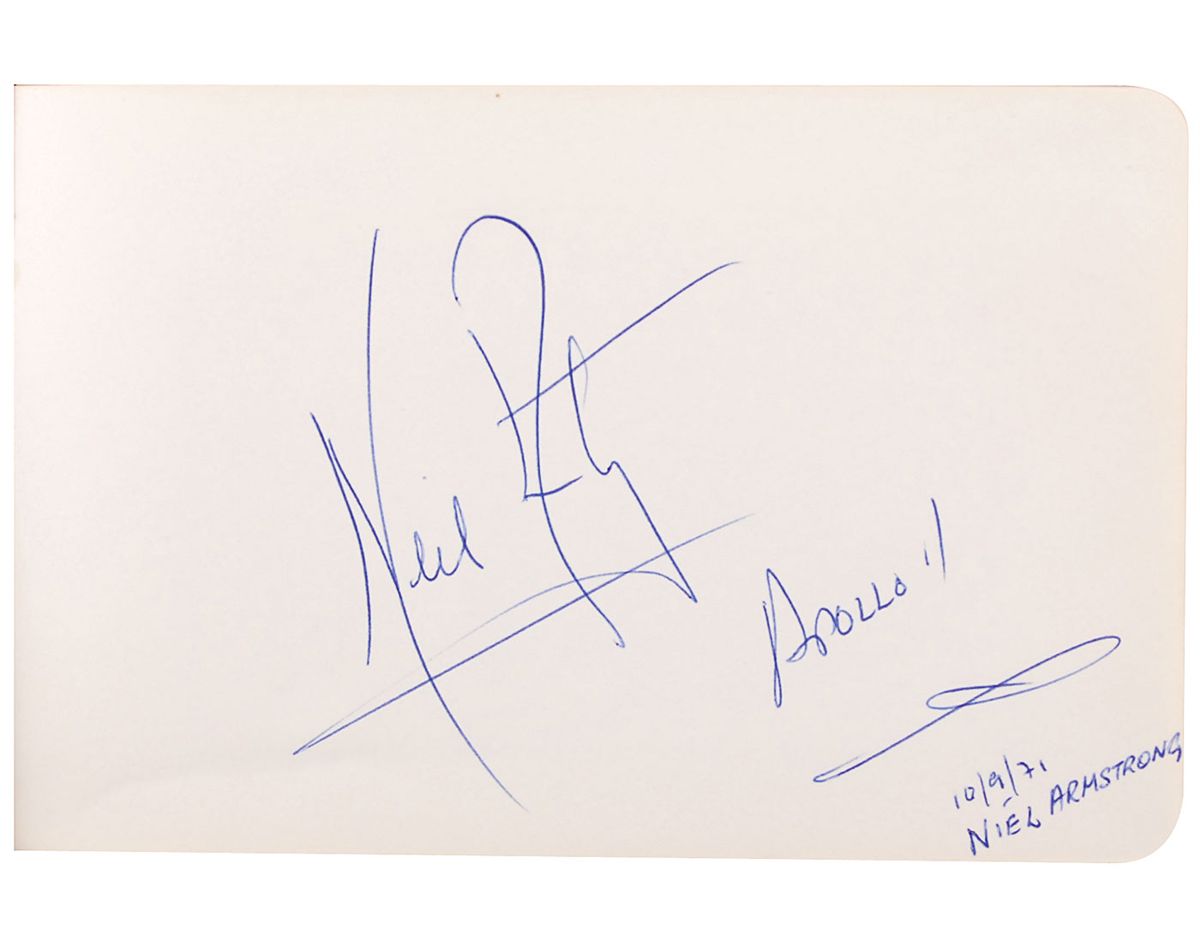 Choice ballpoint signature, “Neil Armstrong, Apollo 11,” on an off-white 6 x 3.75 album page bearing a collector’s date notation of September 10, 1971, still housed within its original autograph album. In fine condition.