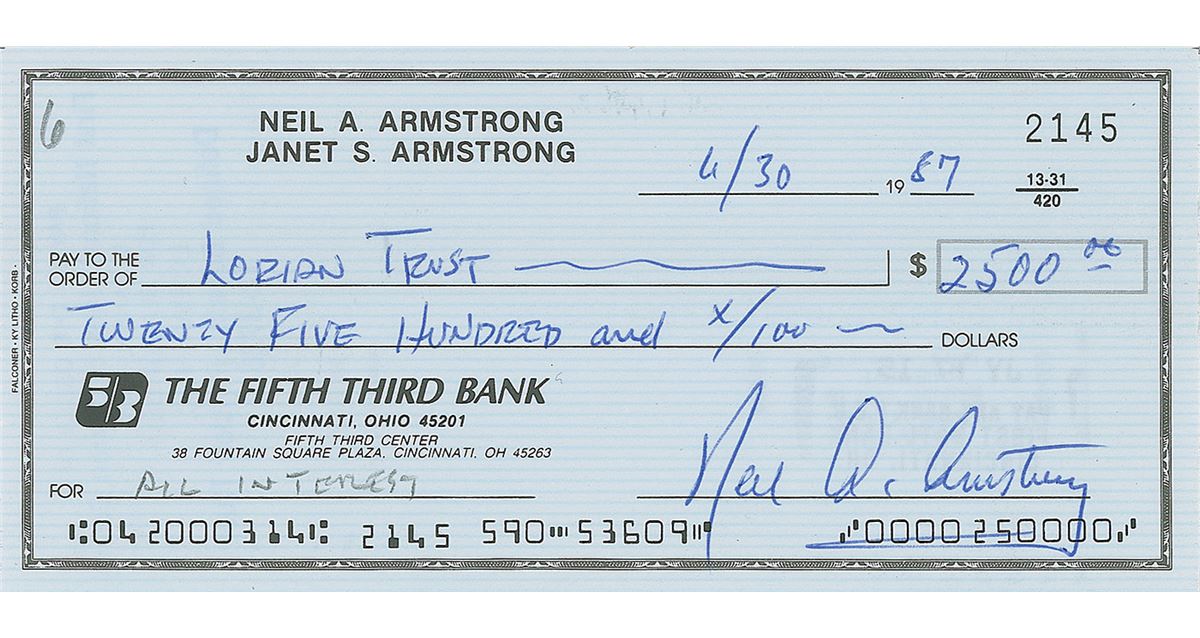 Exceptionally desirable personal check, 6 x 2.75, filled out and signed by Armstrong, “Neil A. Armstrong,” payable to Lorian Trust for $2500, June 30, 1987. Pencil notation by Armstrong on the memo line reads, “All Interest.” In very fine condition. In 1973, Armstrong was president of Lorian, Inc., a business in Lebanon, Ohio, where he lived at the time. An uncommon and much sought-after form of Armstrong’s autograph.