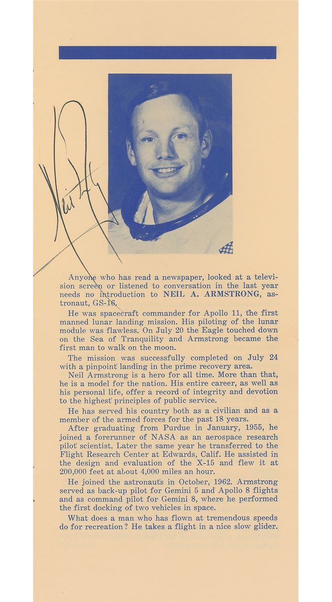 Program for the National Civil Service League’s 16th career service awards held on May 8, 1970, at the Washington Hilton Hotel, 4 x 9, signed on the inside beside his photo in black ballpoint by Armstrong. The front cover also bears a blue ballpoint signature from Supreme Court Justice Arthur J. Goldberg. In fine condition.