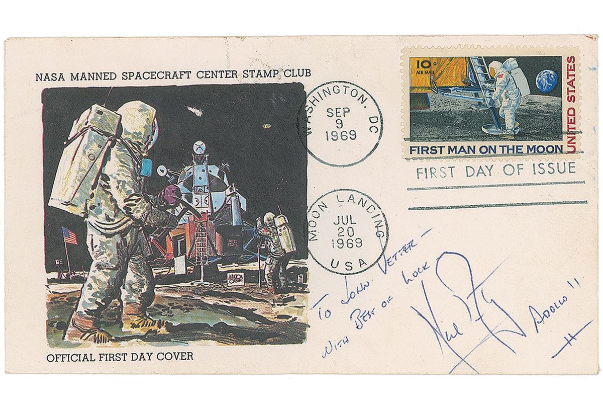 NASA Manned Spacecraft Center Stamp Club FDC with a cachet honoring the moon landing, signed and inscribed in blue ballpoint, “To John Vetter—with best of luck, Neil Armstrong, Apollo 11.” In fine condition, with trivial creasing and soiling.