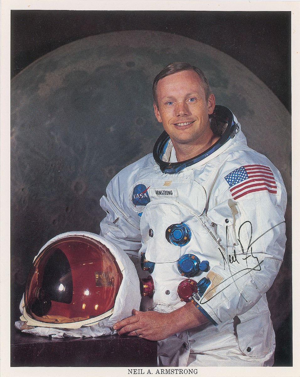Ideal official color 8 x 10 NASA lithograph of Armstrong posing in his white space suit in front of a lunar backdrop, signed in black felt tip. In fine condition.