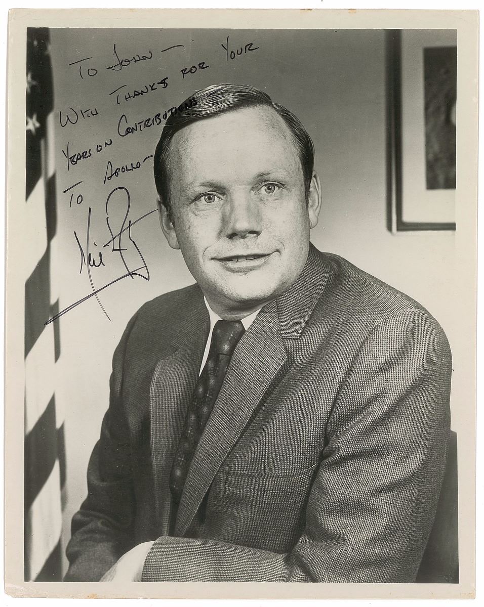 Glossy 8 x 10 photo of Armstrong posing in a suit and tie, signed and inscribed in black felt tip, “To John—with thanks for your years on contributions—To Apollo—Neil Armstrong.” In fine condition, with minor creasing and crazing to borders, and some chipping and surface loss to lower left corner tip.