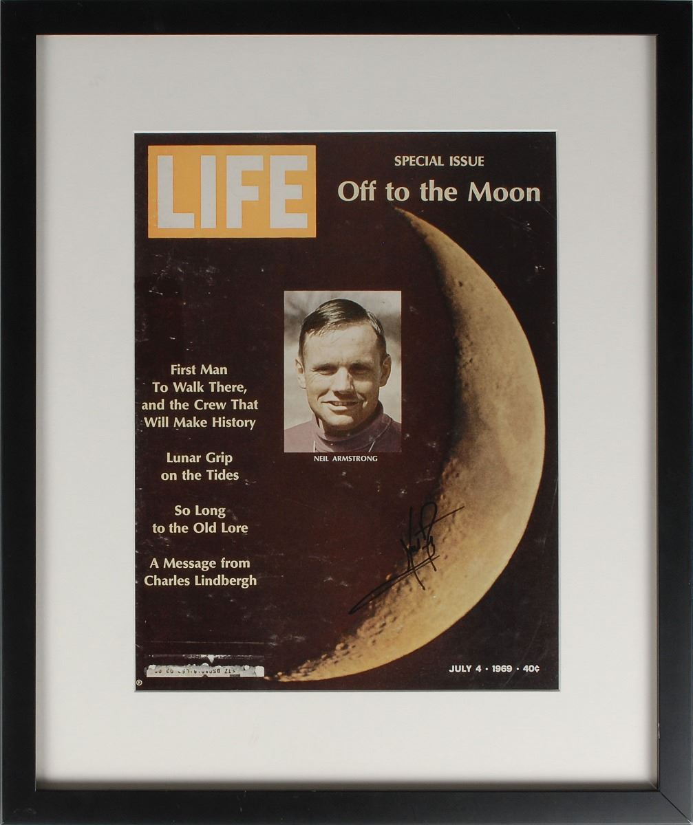 Special ‘Off to the Moon’ issue of Life magazine from July 4, 1969, 10 x 13.25, showing an image of Neil Armstrong set against a crescent moon, signed in black felt tip. Matted and framed. In very good to fine condition, with a partially removed mailing label, and light overall rippling, likely from being mounted. A bold signature on an uncommon format.