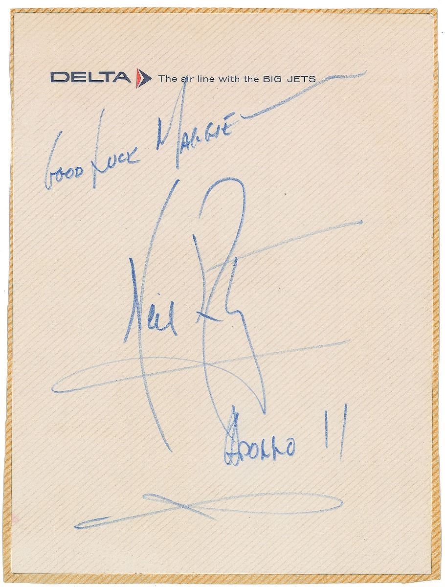Desirable felt tip signature and inscription, “Good Luck Maggie—Neil Armstrong, Apollo 11” on an off-white 5.75 x 7.75 sheet of Delta stationery affixed to a slightly larger cardstock sheet. In fine condition, with light diagonal lines from being affixed to its magnetic photo album backing. Accompanied by a notarized letter of provenance from the original recipient, in part: “I…was employed by Delta Airlines as a Flight Attendant from 1972 to 2016. During a flight from Cincinnati to Miami in the year 1974, I approached Neil Armstrong who was on the flight and asked him to sign a Delta Airlines letterhead note. He did so and personalized it to me.” A much larger than typically seen signature from history’s most famous and sought-after astronaut.