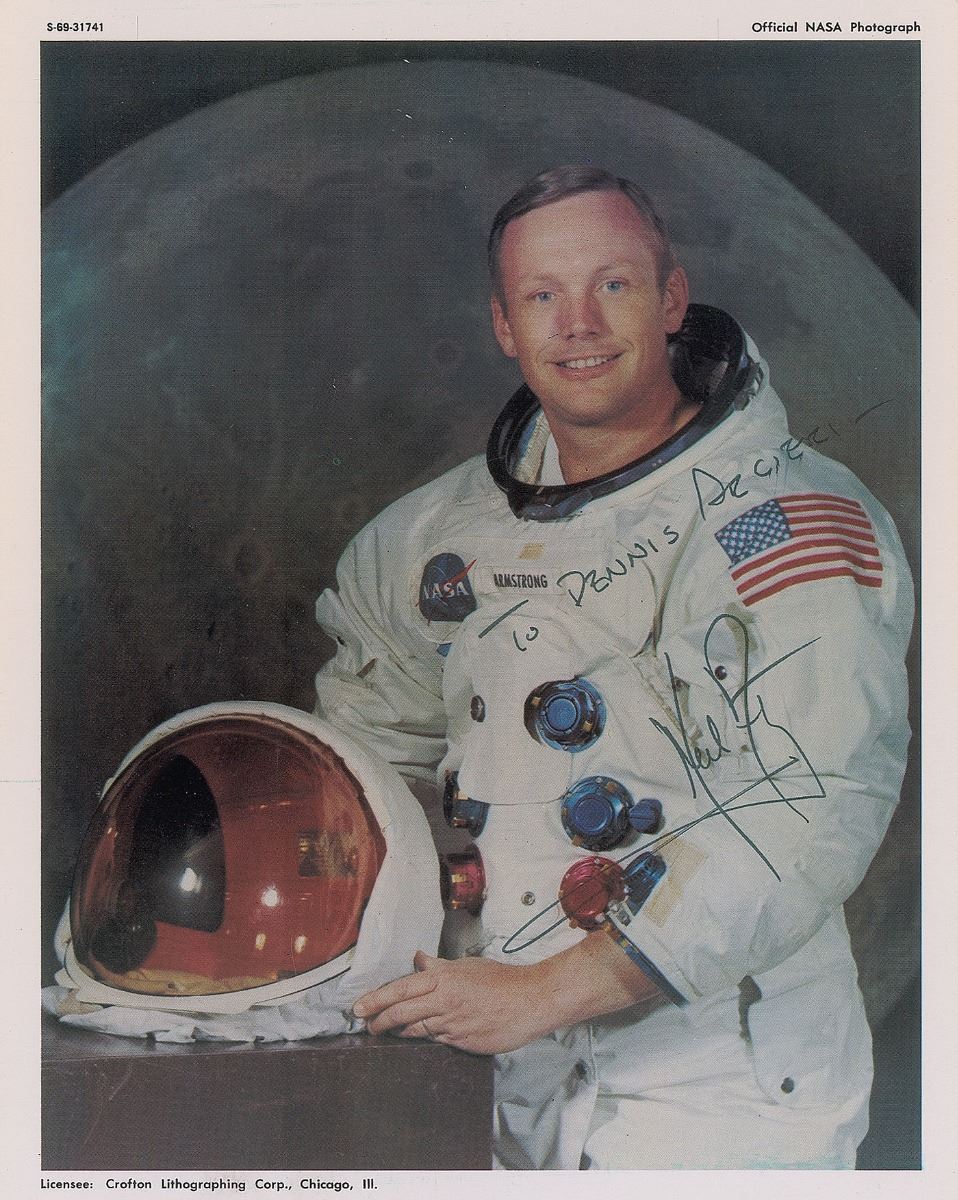 Official color 7.25 x 9 NASA photo of Armstrong posing in his white space suit against a lunar background, signed and inscribed in black felt tip, “To Dennis Arcieri—Neil Armstrong.” In fine condition, with a few scattered light surface impressions, and a trivial brush to inscription. An example of unusual size (it is not trimmed), imprinted in the top border “Official NASA Photograph,” and in the lower border, “Licensee: Crofton Lithographing Corp, Chicago, Ill.”