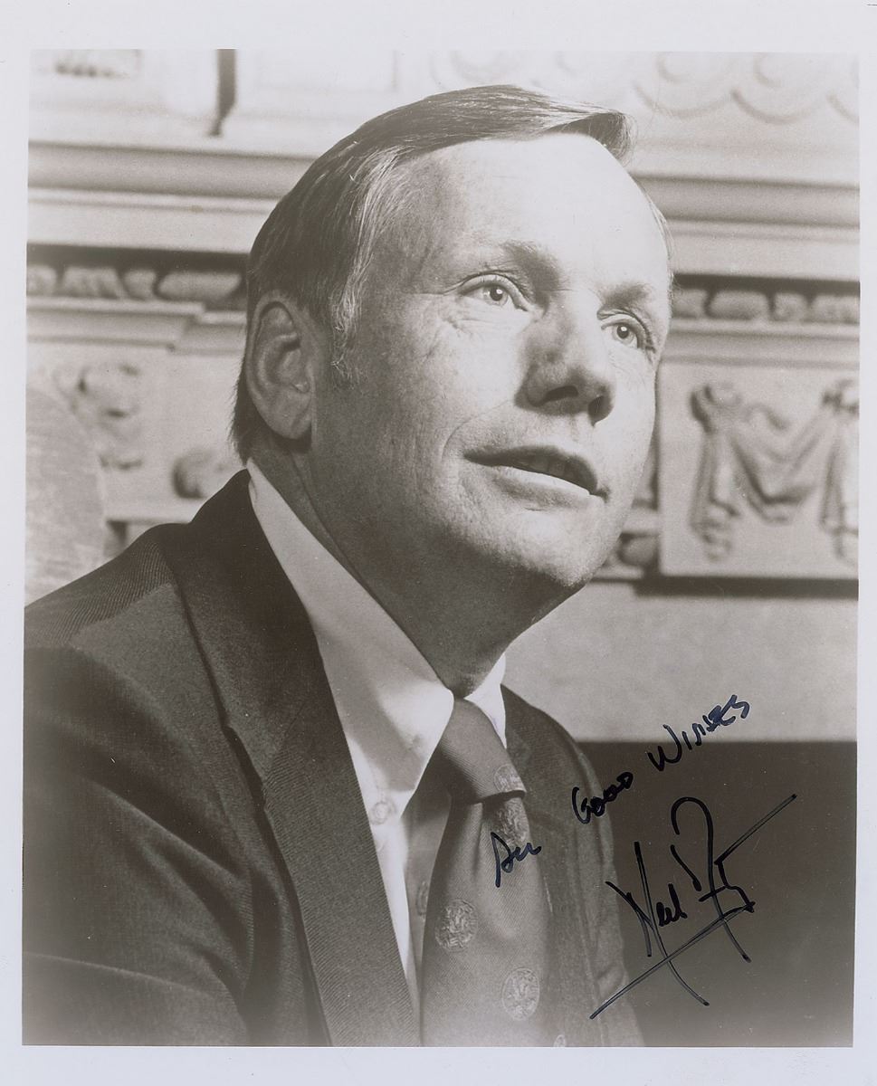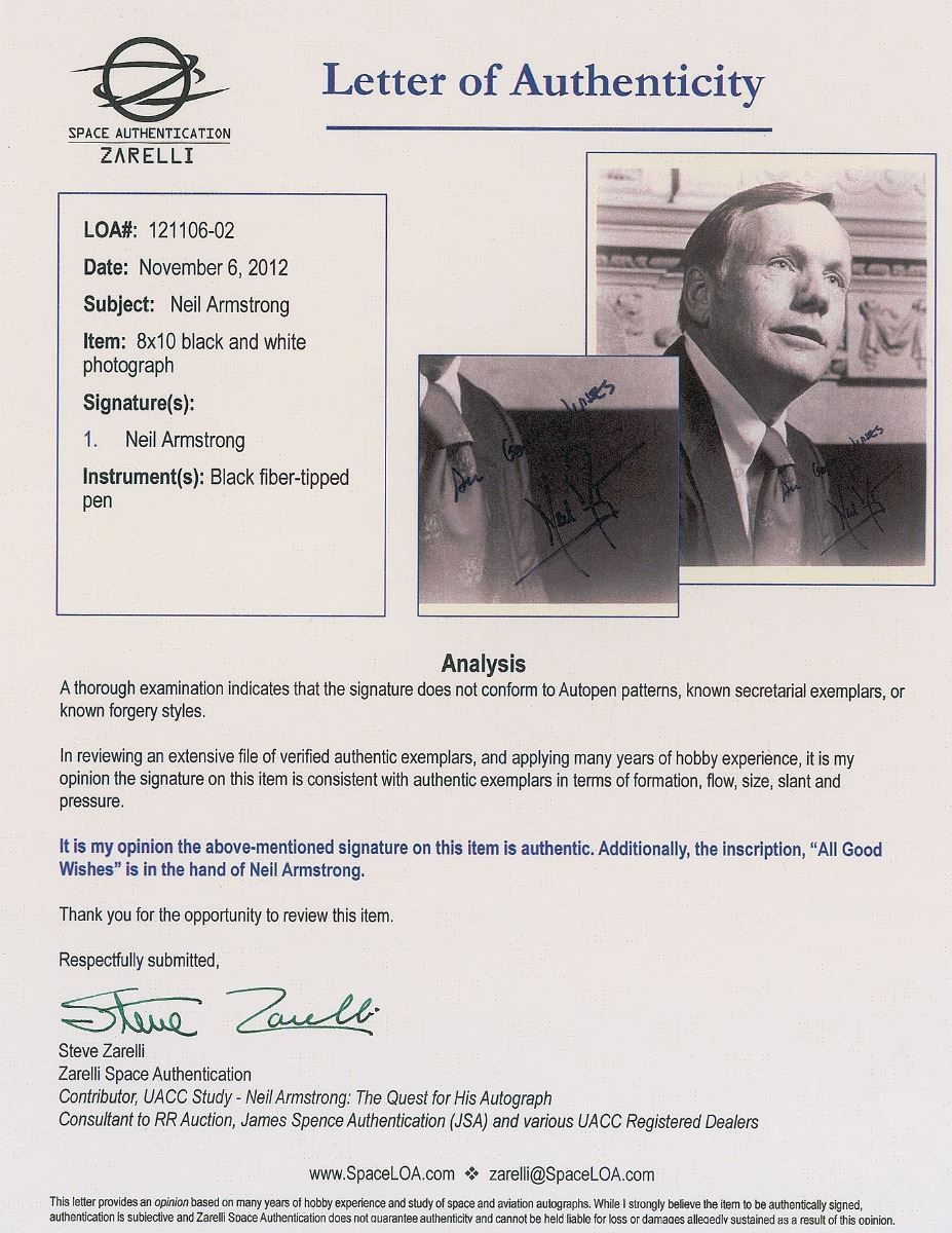 Superb uninscribed glossy 8 x 9.75 photo of Armstrong in a suit and tie, signed in black felt tip, “All good wishes, Neil Armstrong.” In very fine condition. Accompanied by a full letter of authenticity from Steve Zarelli.
