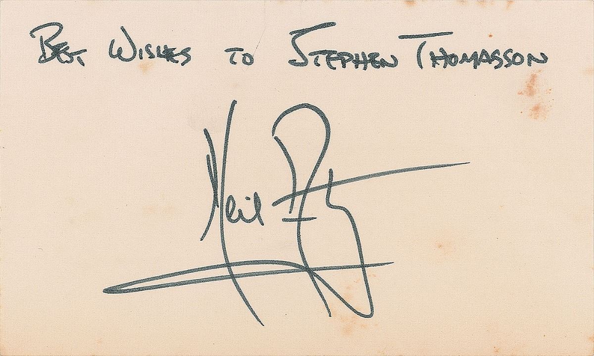 Felt tip signature and inscription, “Best wishes to Stephen Thomasson, Neil Armstrong,” on an off-white 5 x 3 card. In fine condition, with a few light scattered stains.