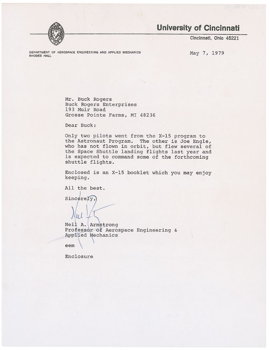TLS, one page, 8.5 x 11, University of Cincinnati letterhead, May 7, 1979. Letter to his friend Buck Rogers, in full: “Only two pilots went from the X-15 program to the Astronaut Program. The other is Joe Engle, who has not flown in orbit, but flew several of the Space Shuttle landing flights last year and is expected to command some of the forthcoming shuttle flights. Enclosed is an X-15 booklet which you may enjoy keeping.” In fine condition, with a paperclip impression to top edge. An interesting piece of correspondence between two names closely related with space travel.
