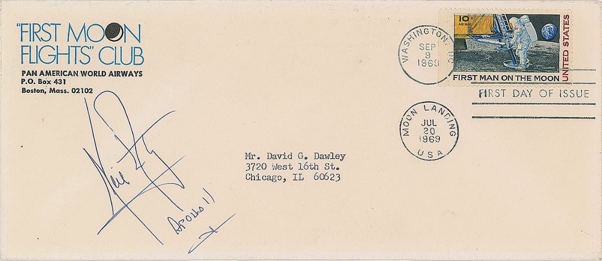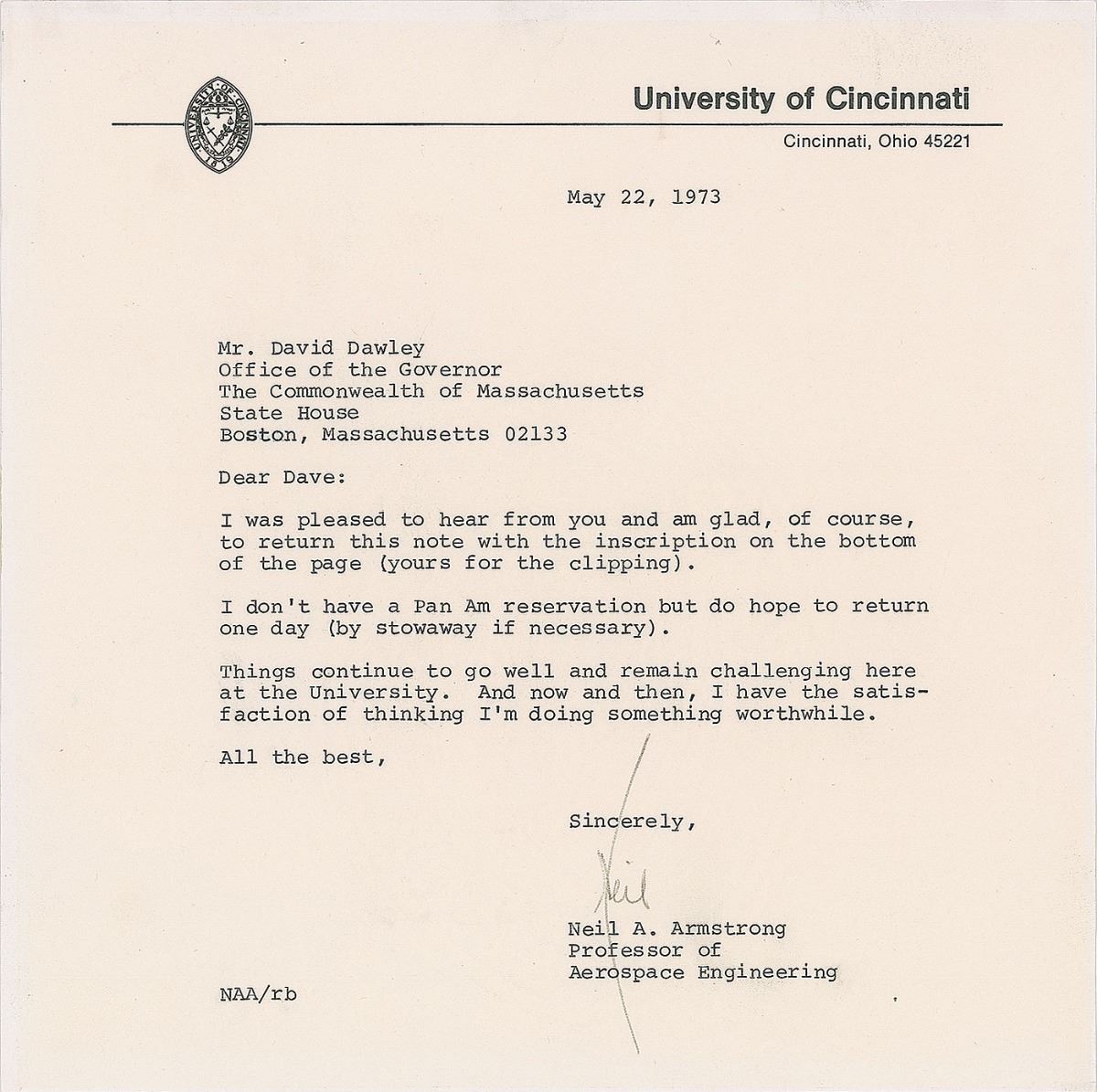 TLS signed “Neil,” one page, 8.5 x 8.5, University of Cincinnati letterhead, May 22, 1973. Letter to David Dawley, in full: “I was pleased to hear from you and am glad, of course, to return this note with the inscription on the bottom of the page (yours for the clipping). I don’t have a Pan Am reservation but do hope to return one day (by stowaway if necessary). Things continue to go well and remain challenging here at the University. And now and then, I have the satisfaction of thinking I’m doing something worthwhile.” Includes the original mailing envelope, which is signed in blue ballpoint, “Neil Armstrong, Apollo 11.” Also included is a First Moon Flights Club card issued to David Dawley, an unsigned photo of Armstrong in mid handshake, and a Western Union telegram, dated May 14, 1970, addressed to Dawley from Armstrong, in part: “It is an honor to serve with you as a member of the Peace Corps National Advisory Council appointed by President Nixon.” In overall fine condition.