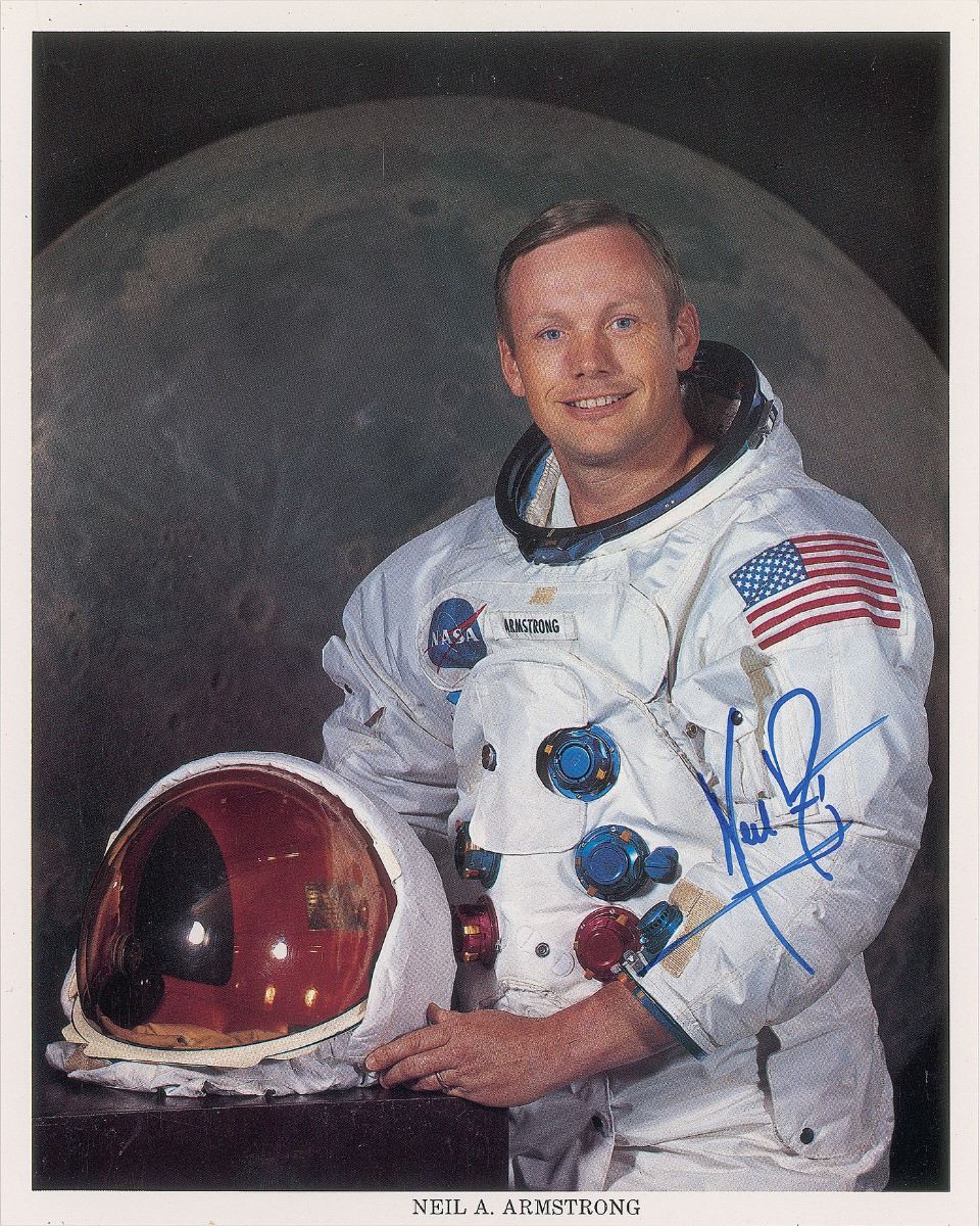 Exceptional official color 8 x 10 NASA lithograph of Armstrong in his white space suit, boldly signed in blue felt tip. In fine condition. Accompanied by a full letter of authenticity from Zarelli Space Authentication.