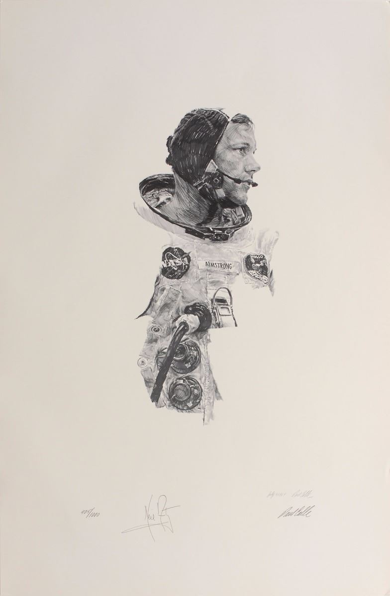 Limited edition 19 x 29 lithograph of Armstrong in his flight suit prior to the Apollo 11 mission, numbered 405/1000, signed in pencil by history’s first moonwalker. Also signed in pencil by the artist, Paul Calle, beneath his pre-printed signature. Housed inside a 19.25 x 29.25 presentation folder captioned above, “Neil Armstrong by Paul Calle,” and along the bottom, “National Air and Space Museum for the Charles A. Lindbergh Memorial Fund.” In very fine condition. This highly desirable, virtually pristine item is the only individual print edition that Armstrong signed.
