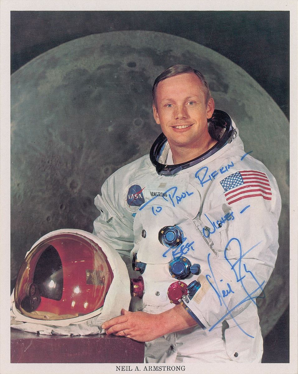 Official color 8 x 10 NASA lithograph of Armstrong posing in his white space suit against a lunar backdrop, signed and inscribed in blue felt tip, “To Paul Rifkin—Best Wishes—Neil Armstrong.” In fine condition, with a few small creases to the background.