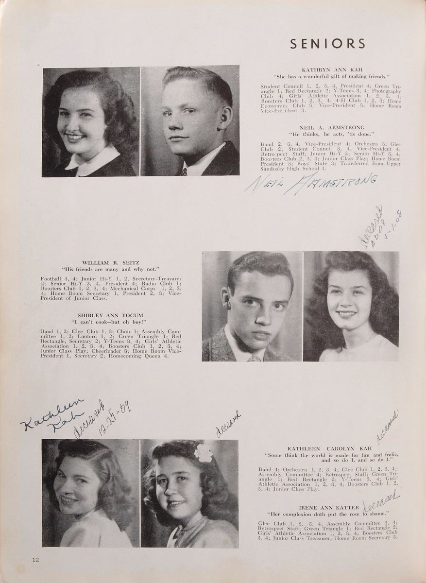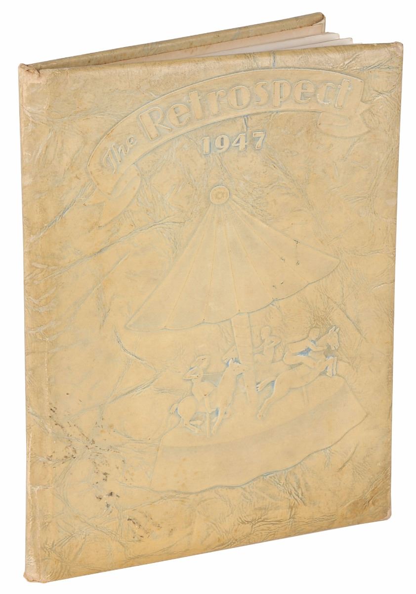 The Retrospect yearbook, dating from Armstrong’s senior year at Blume High School in Wapakoneta, Ohio, in 1947, hardcover, 8 x 11, 88 pages. Armstrong’s senior portrait is at the top of page 12; he has signed in ink under his activities, “Neil Armstrong,” and, on the adjacent page, has penned the name “Mary Hartup,” a fellow classmate and band officer who is pictured with Armstrong on page 44. Among the activities he participated in during his three years at school are “Band (2,3,4), Vice-President 4,” and “Student Council 3,4.” Armstrong is pictured an additional six times in the yearbook, twice in the band (pp. 44-45), twice for Student Council (p. 57), and twice with the Senior Hi–Y (p. 52), whose information reads, in part: “Clean Living–self-discipline in everyday life, Clean Speech–decency in conversation, Clean Scholarship–honesty in school, Clean Sportsmanship–fairness in athletics.” In very good to fine condition, with covers detached but present, and two central sheets also detached but present. Armstrong’s dedication to such creeds as those endorsed by the Senior Hi–Y, including “clean living,” “self-discipline,” and “decency,” would go on to serve him well in life—especially in the Apollo 11 moon landing and the demands of a post-NASA life as a living legend.