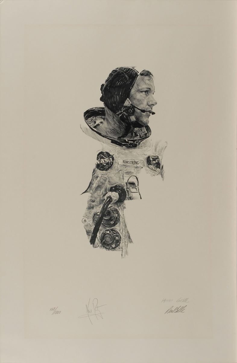 Limited edition 19 x 29 lithograph of Armstrong in his flight suit prior to the Apollo 11 mission, numbered 568/1000, signed in pencil by history’s first moonwalker. Also signed in pencil by the artist, Paul Calle, beneath his pre-printed signature. In fine condition, with a light block of uniform toning from prior display. This highly desirable, virtually pristine item is the only individual print edition that Armstrong signed. Pre-certified Zarelli Space Authentication.