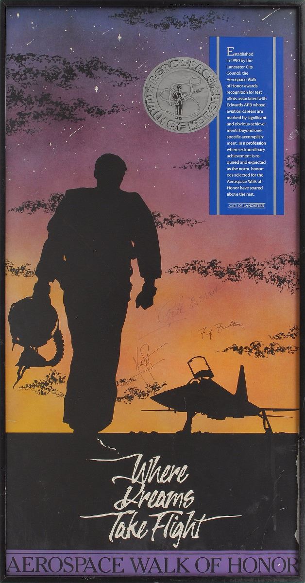 Attractive color 14.5 x 29.75 Aerospace Walk of Honor poster entitled 'Where Dreams Take Flight,' showing the silhouette of a pilot walking to his aircraft, signed in black ink or ballpoint by Neil Armstrong, Fitz Fulton, and Frank 'Pete' Everest. Framed and in fine condition. Accompanied by a full letter of authenticity from JSA. Pre-certified Zarelli Space Authentication.