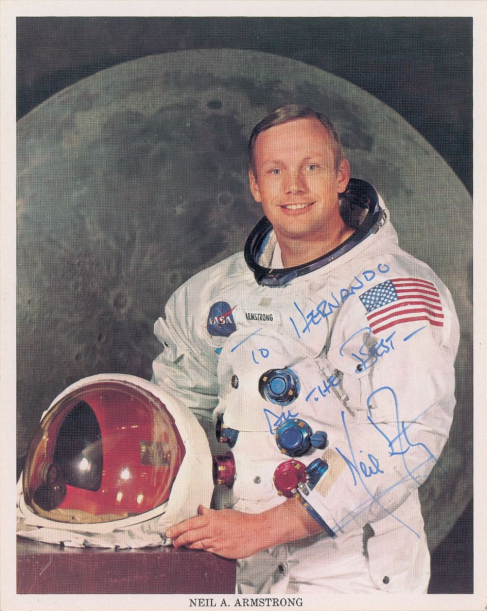 Official color 8 x 10 NASA lithograph of Armstrong in his white space suit, signed and inscribed in blue felt tip, "To Hernando, All the Best-Neil Armstrong." In fine condition.