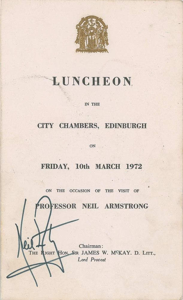 Menu for a luncheon hosted in the City Chambers of Edinburgh, Scotland, "on the occasion of the visit of Professor Neil Armstrong," March 10, 1972, two pages, 4.75 x 8, signed on the front in black felt tip by Armstrong. In very good to fine condition, with light soiling and creasing. The consignor notes that this was signed for his father, Councilor A. D. Wilson.