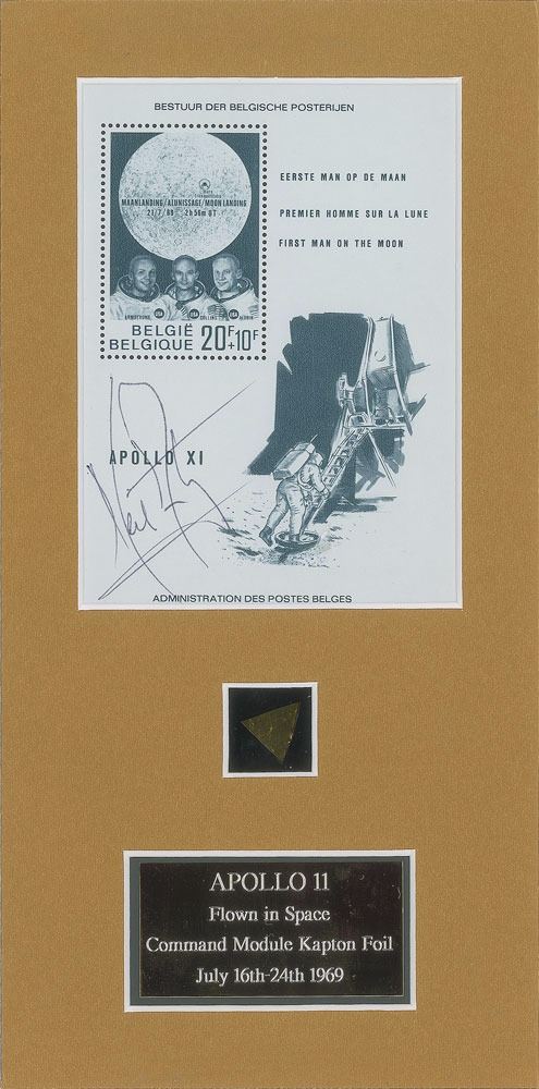 Extremely desirable pairing of items related to the Apollo 11 mission: a ballpoint signature, "Neil Armstrong," on a 3.5 x 4.75 Sieger Stamp Block; and a flown .5 x .5 swatch of Kapton foil removed from the Apollo 11 Command Module Columbia’s thermal protection subsystem. Both items are matted with an engraved plaque to an overall size of 5 x 10.25. In overall fine condition.