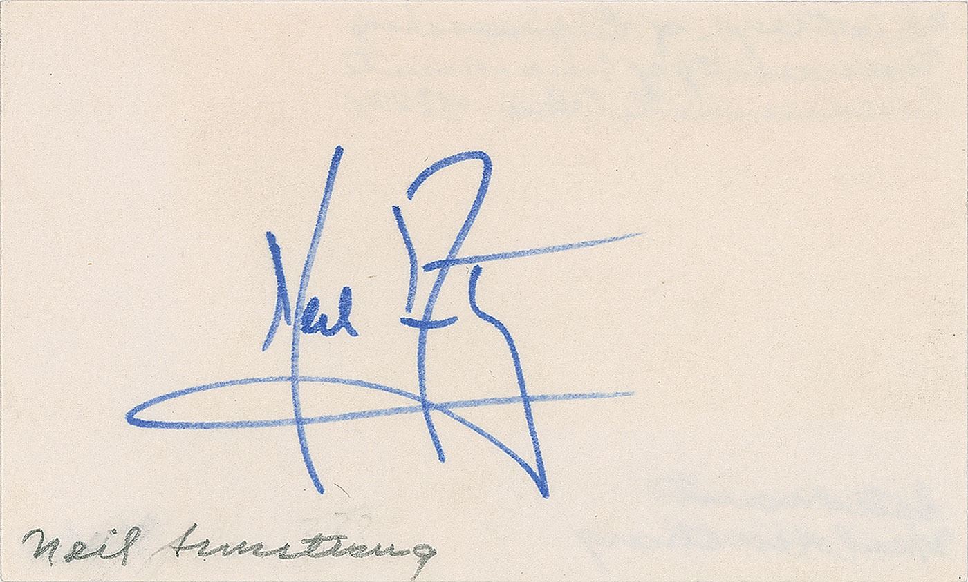 Blue felt tip signature, "Neil Armstrong,” on an off-white 5 x 3 card. Collector's notations on reverse indicate that the signature was obtained on September 30, 1980. In fine condition.