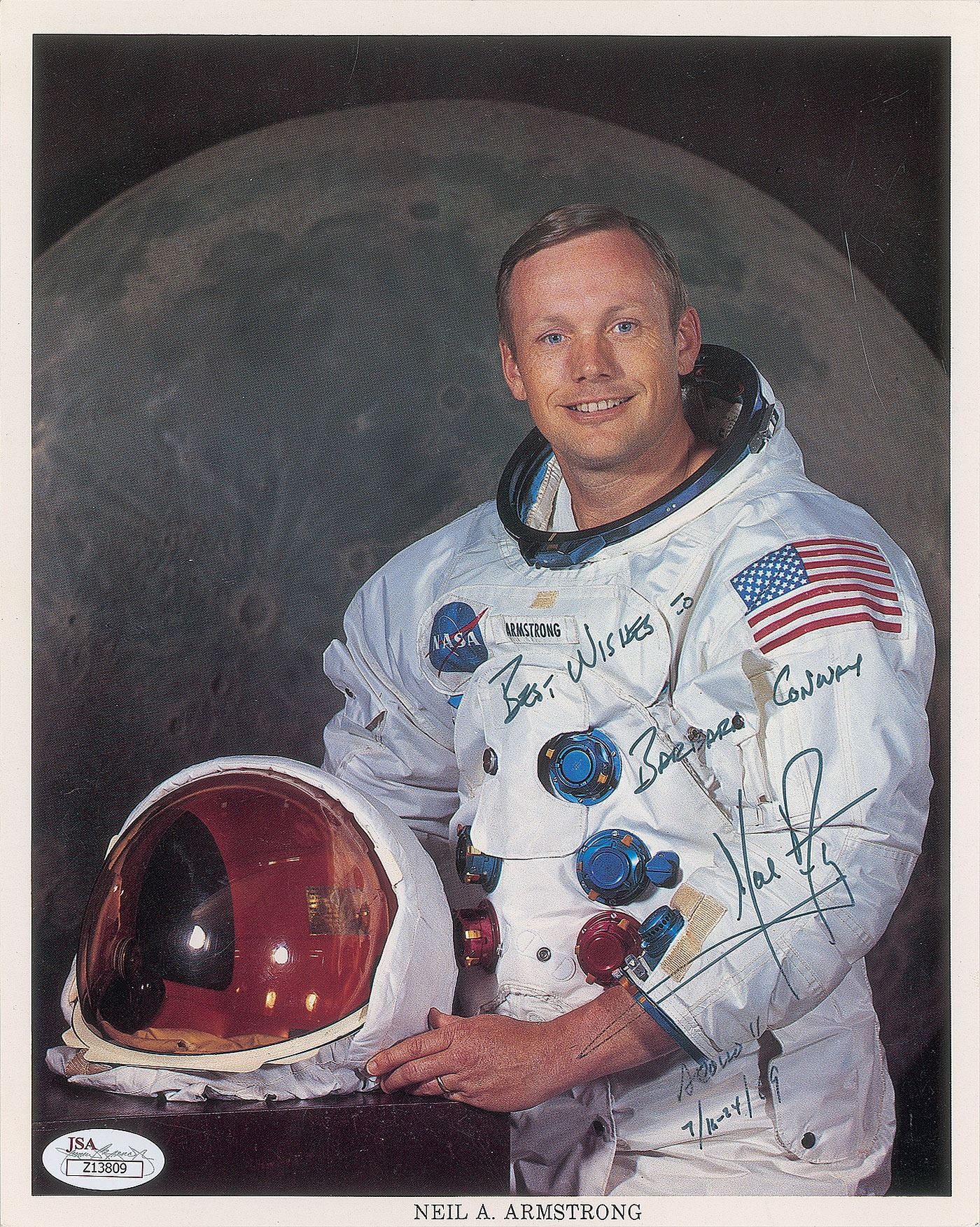 Official color 8 x 10 NASA lithograph of Armstrong posing in his white space suit, signed and inscribed in black felt tip, "Best wishes to Barbara Conway, Neil Armstrong, Apollo 11, 7/16–24/69.” In fine condition, with a couple trivial surface scratches and a JSA label affixed to the lower left corner. Accompanied by a full letter of authenticity from JSA. A desirable example boasting the unusual addition of the Apollo 11 mission name and dates.