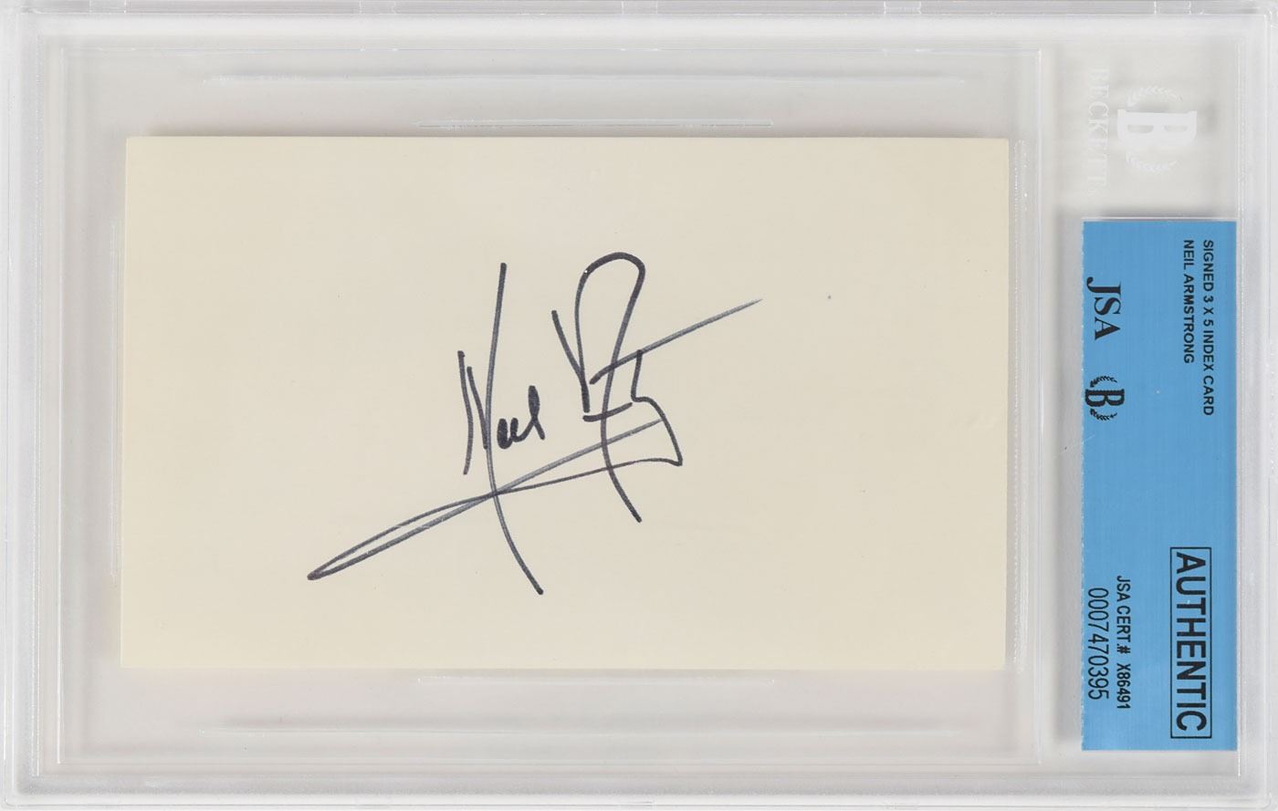 Bold felt tip signature, "Neil Armstrong,” on an off-white 5 x 3 card. Encapsulated in a plastic JSA/Beckett authentication holder. In very fine condition.