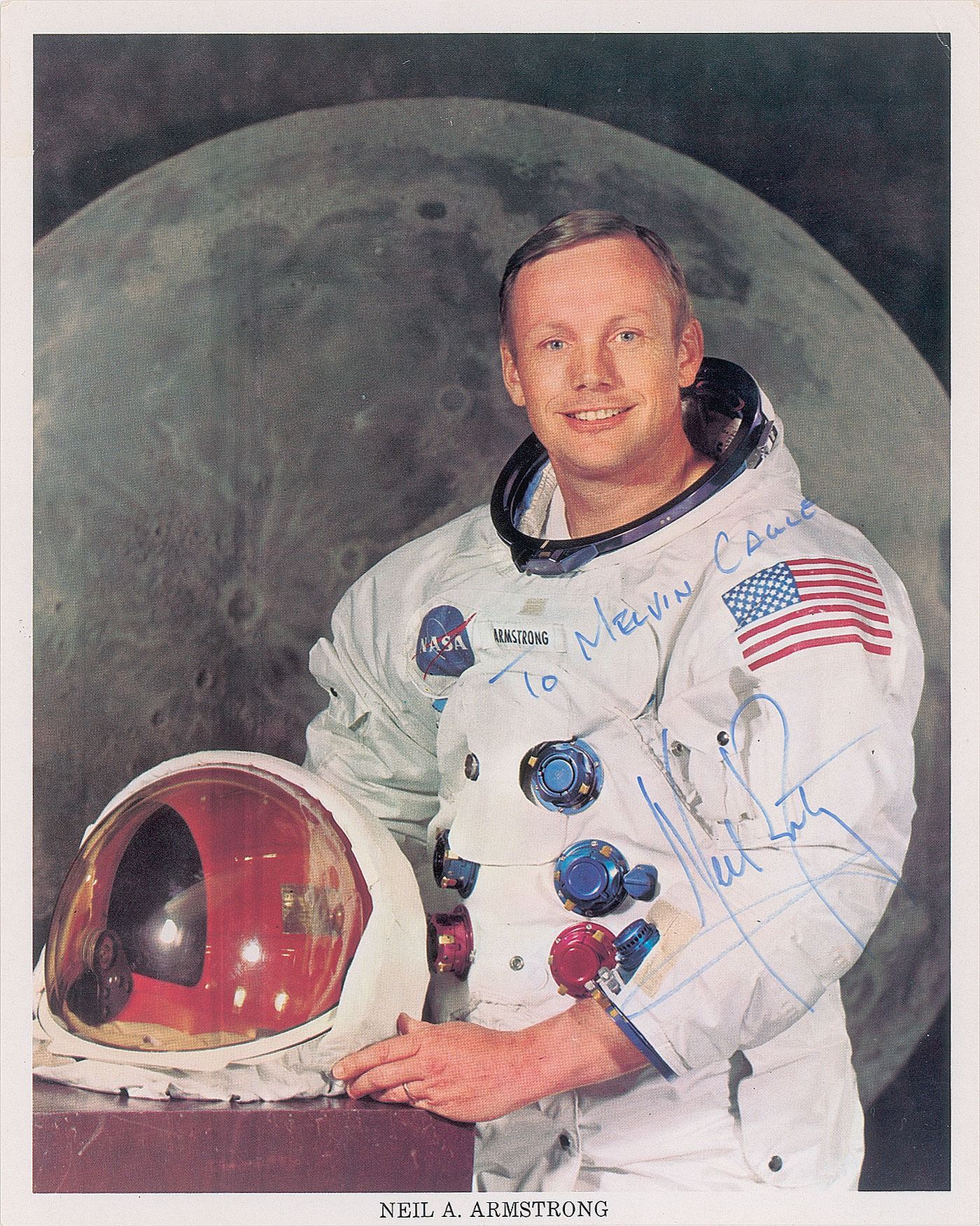Official color 8 x 10 NASA lithograph of Armstrong posing in his white space suit, signed and inscribed in blue felt tip, "To Melvin Cagle, Neil Armstrong.” In very good to fine condition, with light bends and creases (especially to upper right corner), and two paperclip impressions to the edges. Accompanied by the original Johnson Space Center mailing envelope and a full letter of authenticity from JSA.
