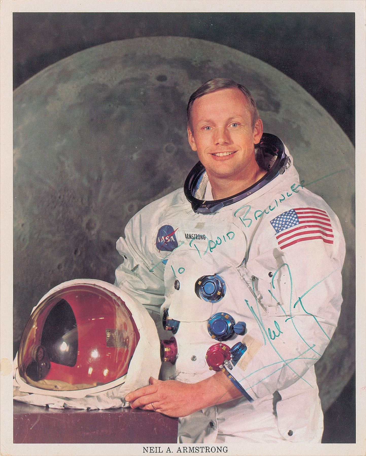 Official color 8 x 10 NASA lithograph of Armstrong in his white space suit against a lunar backdrop, signed and inscribed in green felt tip, "To David Ballinger, Neil Armstrong.” In fine condition, with a light paperclip impression to the top edge and bands of toning to reverse. Accompanied by a full letter of authenticity from JSA.