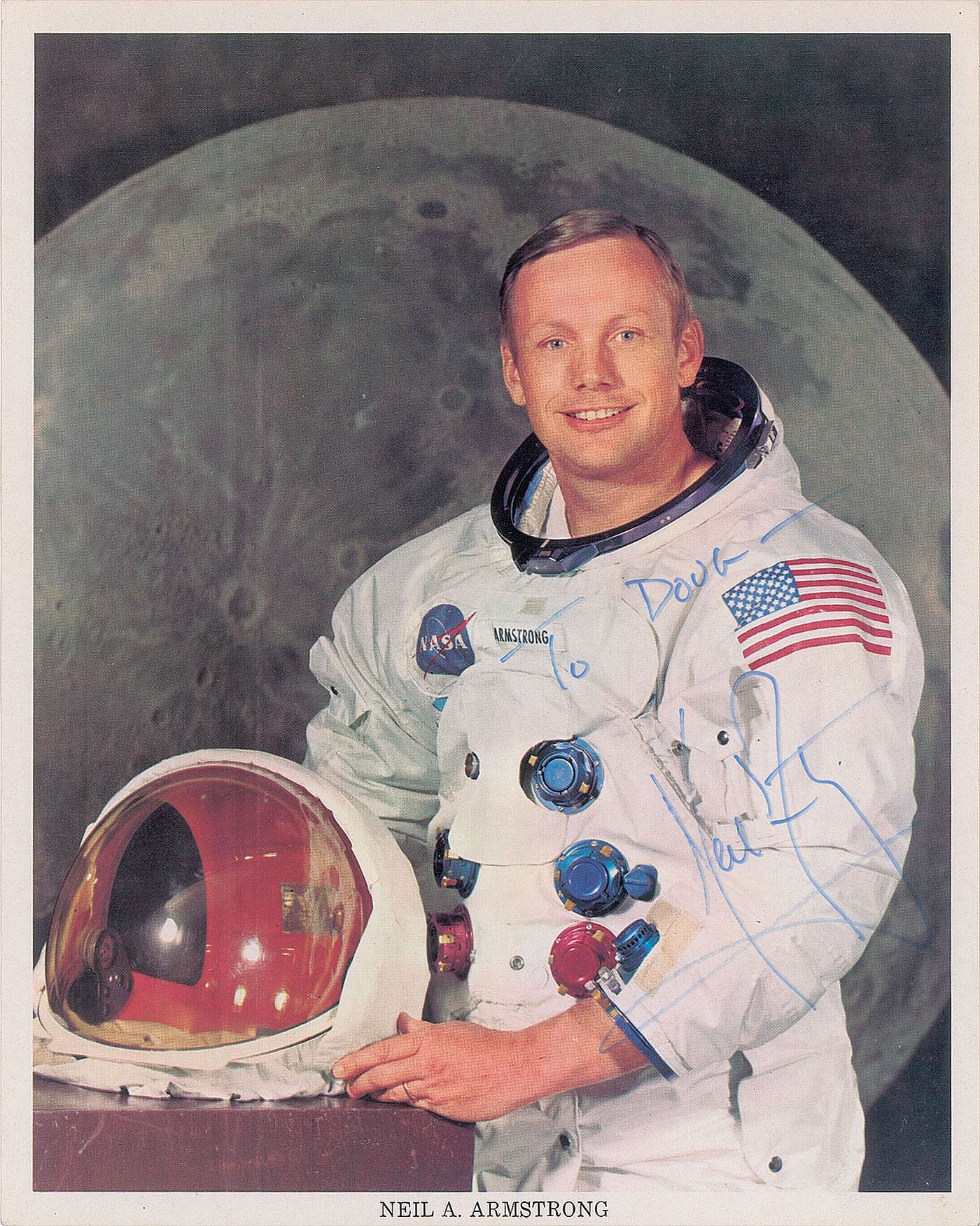 Official color 8 x 10 NASA lithograph of Armstrong in his white space suit, signed and inscribed in blue felt tip, "To Doug—Neil Armstrong.” In fine condition, with a small crease and light paperclip impression to the top edge.