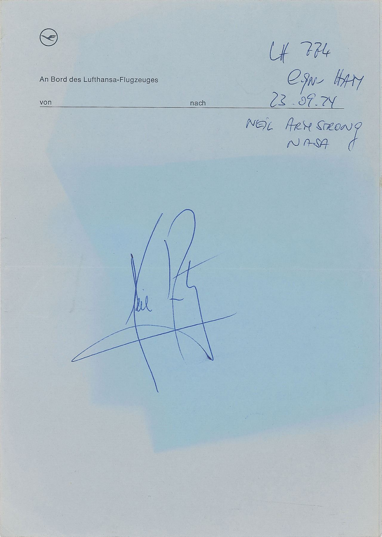 Ballpoint signature, "Neil Armstrong,” on a blue 5.75 x 8.25 sheet with collector's notations to upper right corner. In very good to fine condition, with somewhat irregular toning over most of the signature.